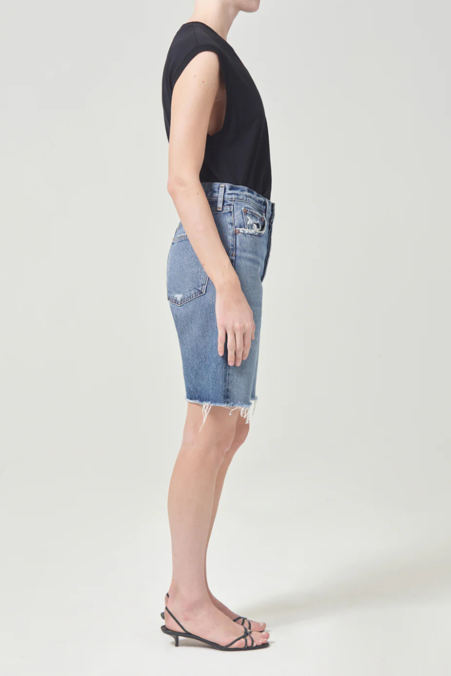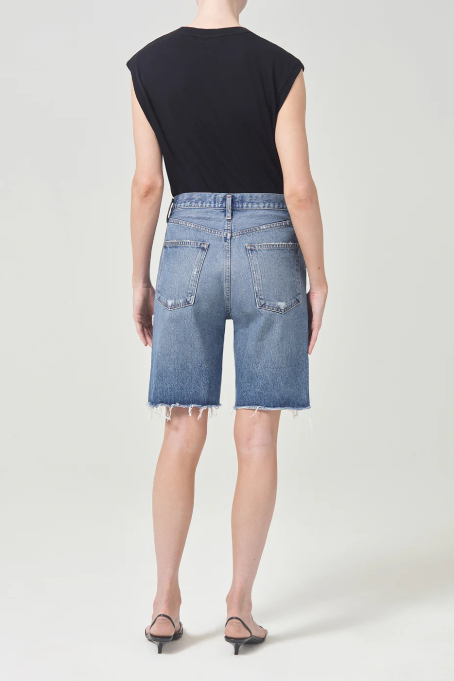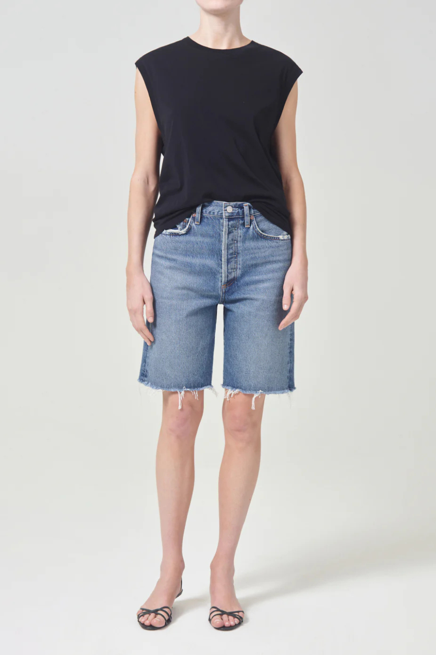 Inspired by our best-selling 90's fit, the 90's short is relaxed on the wiast with a raw hem above the knee.