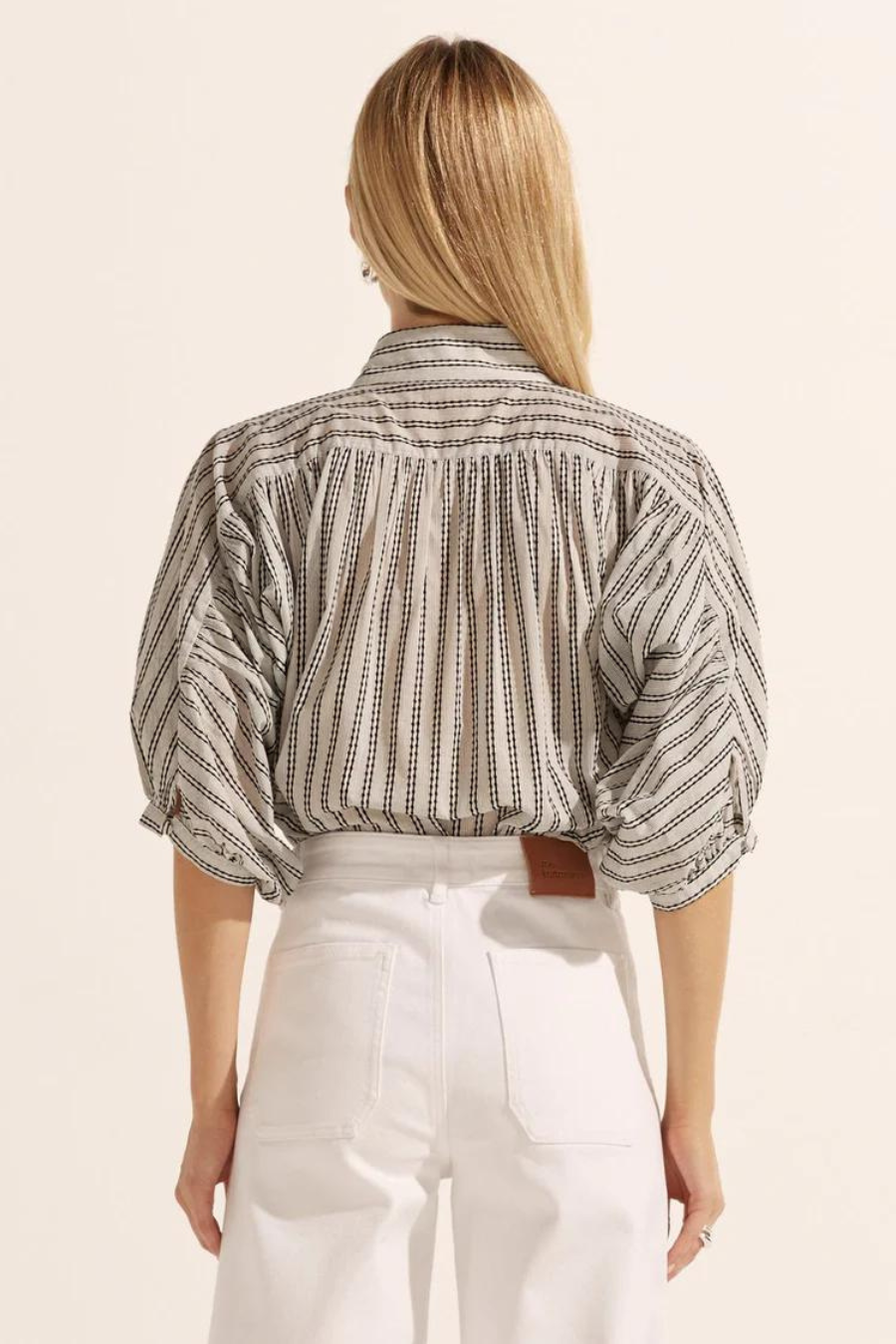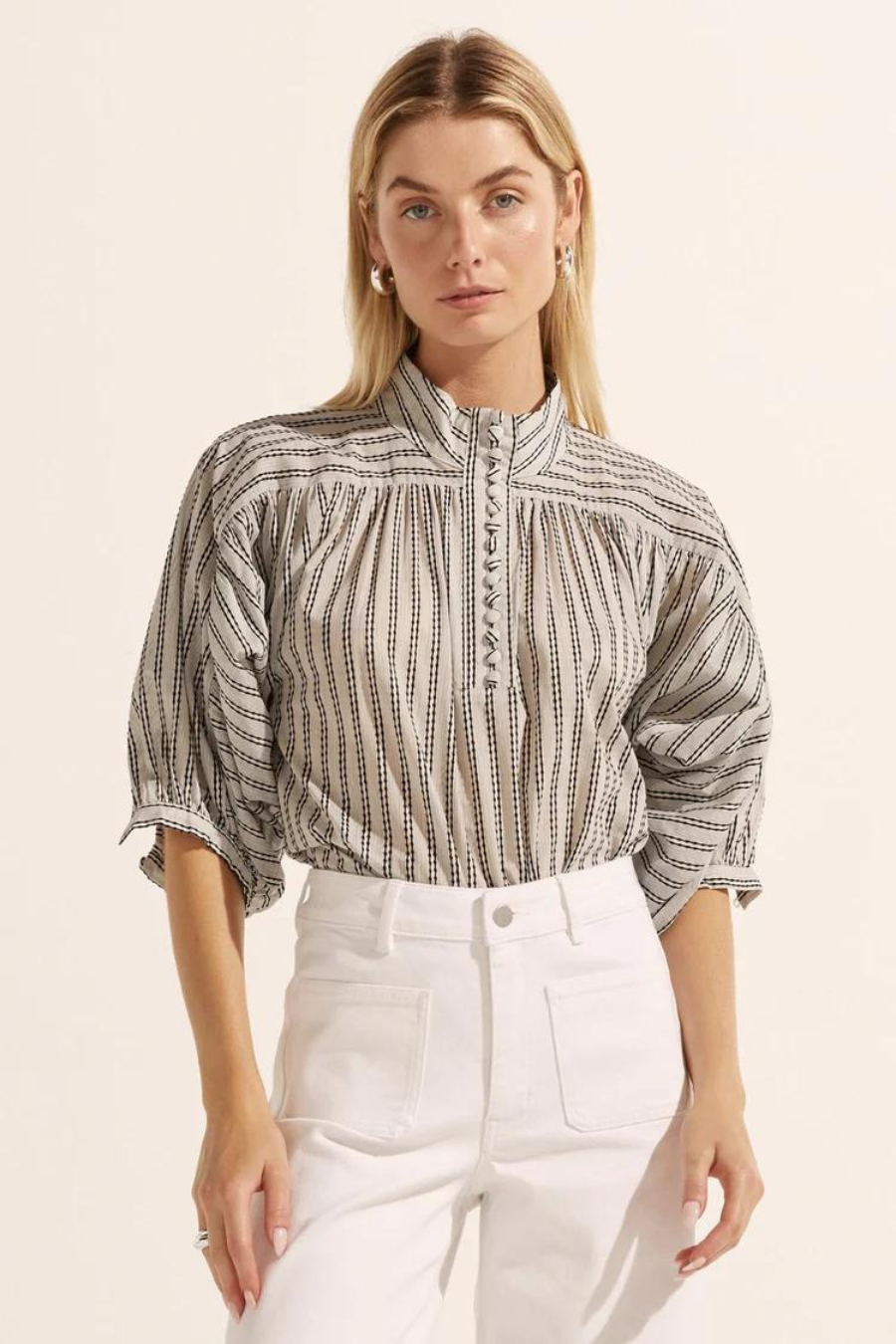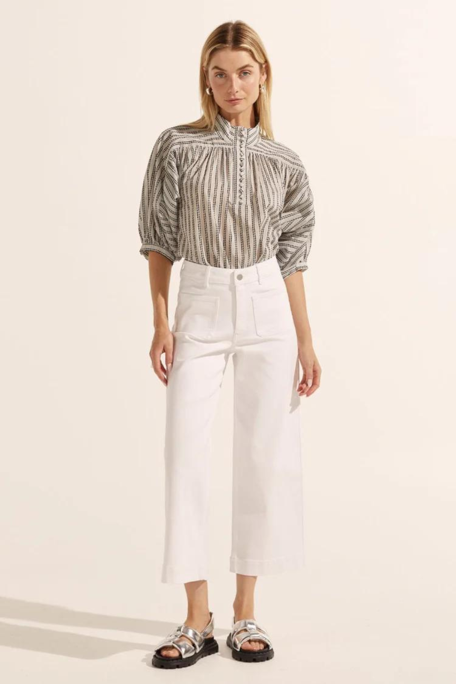 Scalloped lace trim injects a romantic notion to this modern and confident piece, crafted in a light-weight ramie the adage teams delightfully with denim or with a tailored pant.