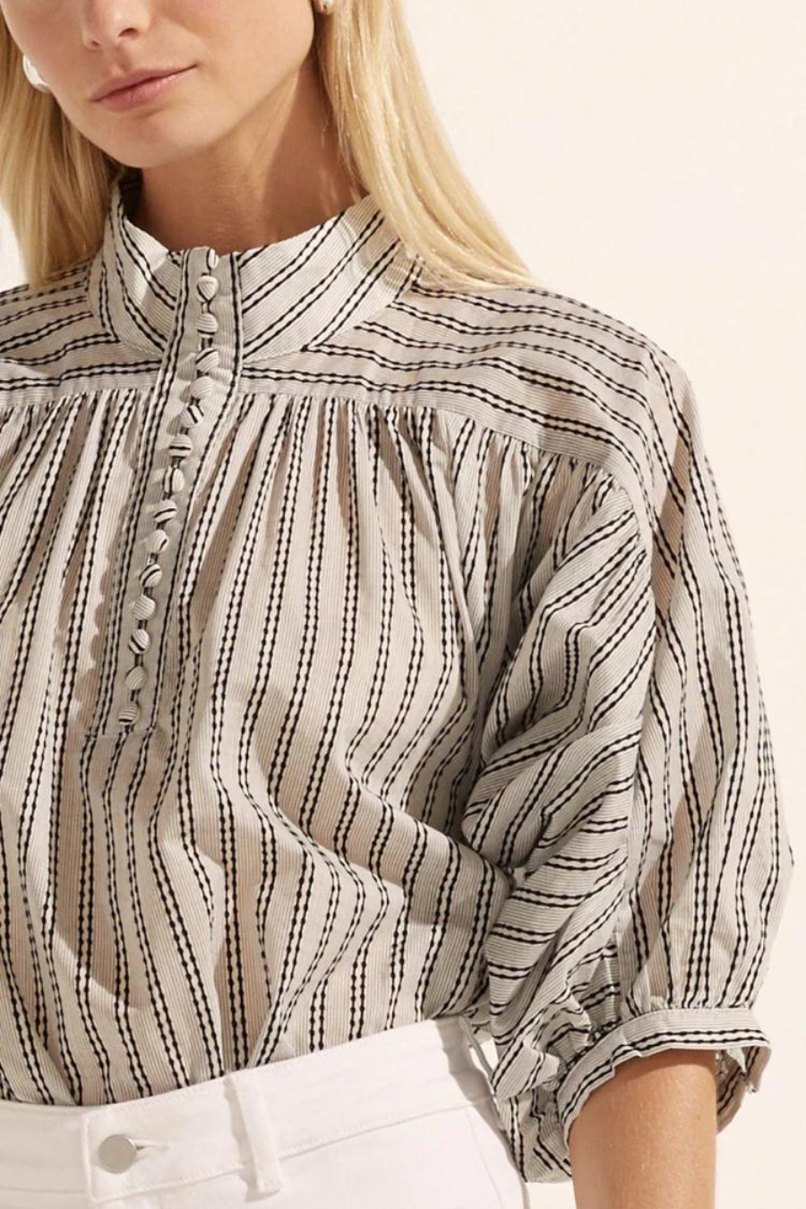 A high neck stand and a row of covered buttons leads into a gathered bodice and sleeve.