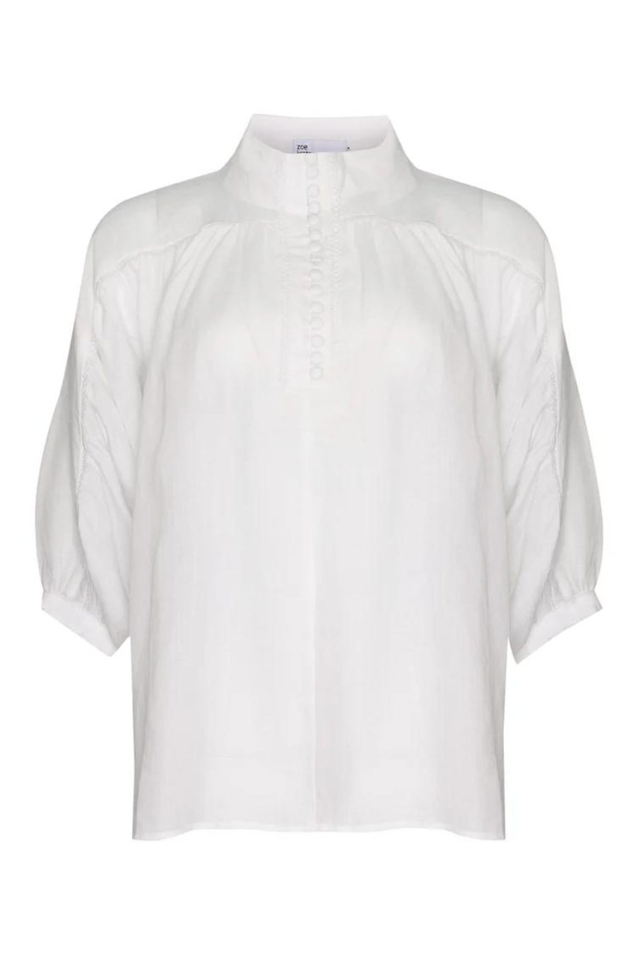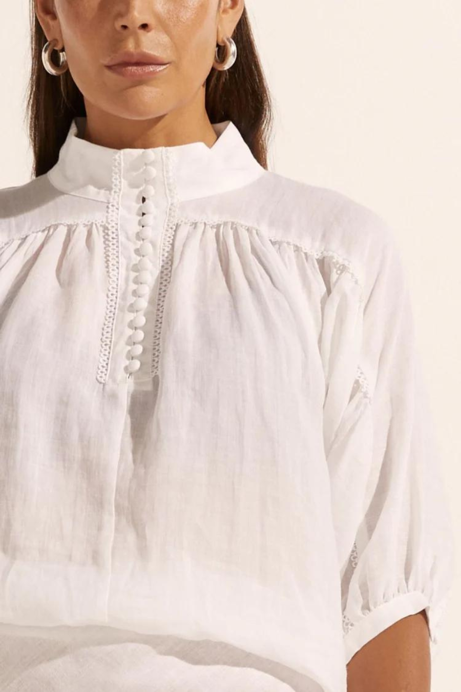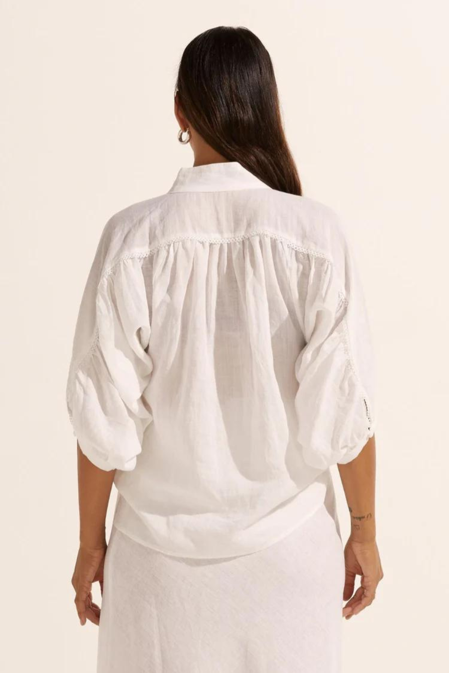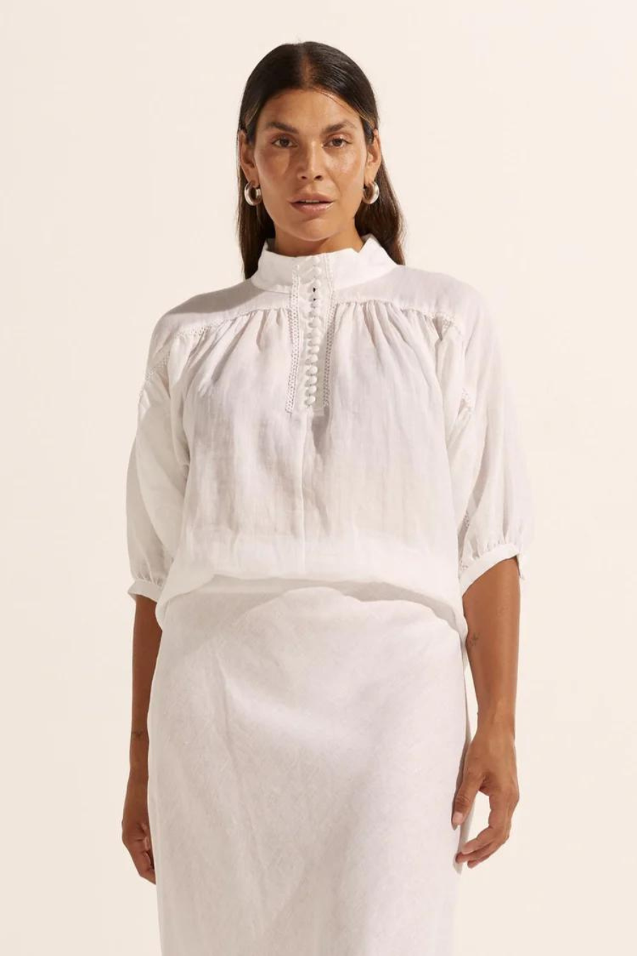 Scalloped lace trim injects a romantic notion to this modern and confident piece, crafted in a light-weight ramie the adage teams delightfully with denim or with a tailored pant.
