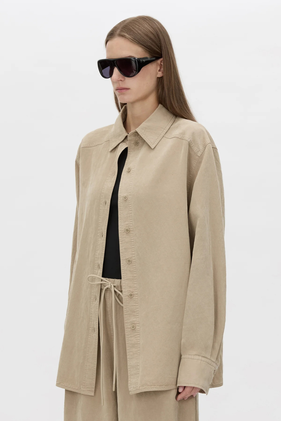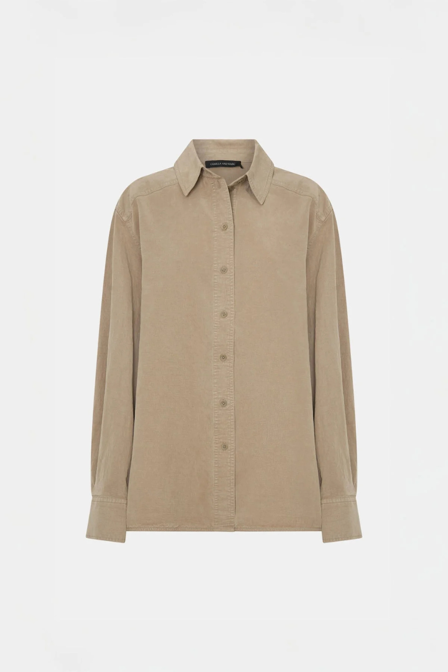 CAMILLA AND MARC Adakite collared brown oversized shirt with corozo buttons. Long sleeves, side splits, classic collar.