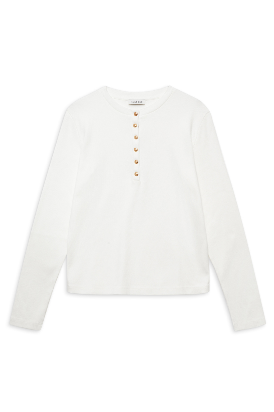 The Alessia Long Sleeve Tee is a modern Henley made from a dense cotton-spandex blend with an all-over ribbed texture and a soft hand. This elevated basic features a high crew neckline and gold monogram snap buttons along the front placket.