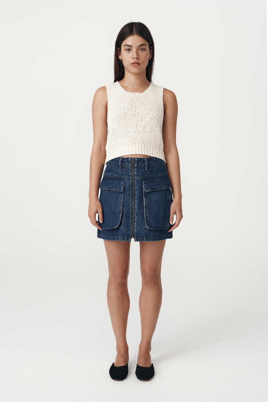 A refined denim mini skirt with a softly washed finish, oversized patch pockets and a clean zip-through front. Structured with an effortlessly modern, utilitarian feel.