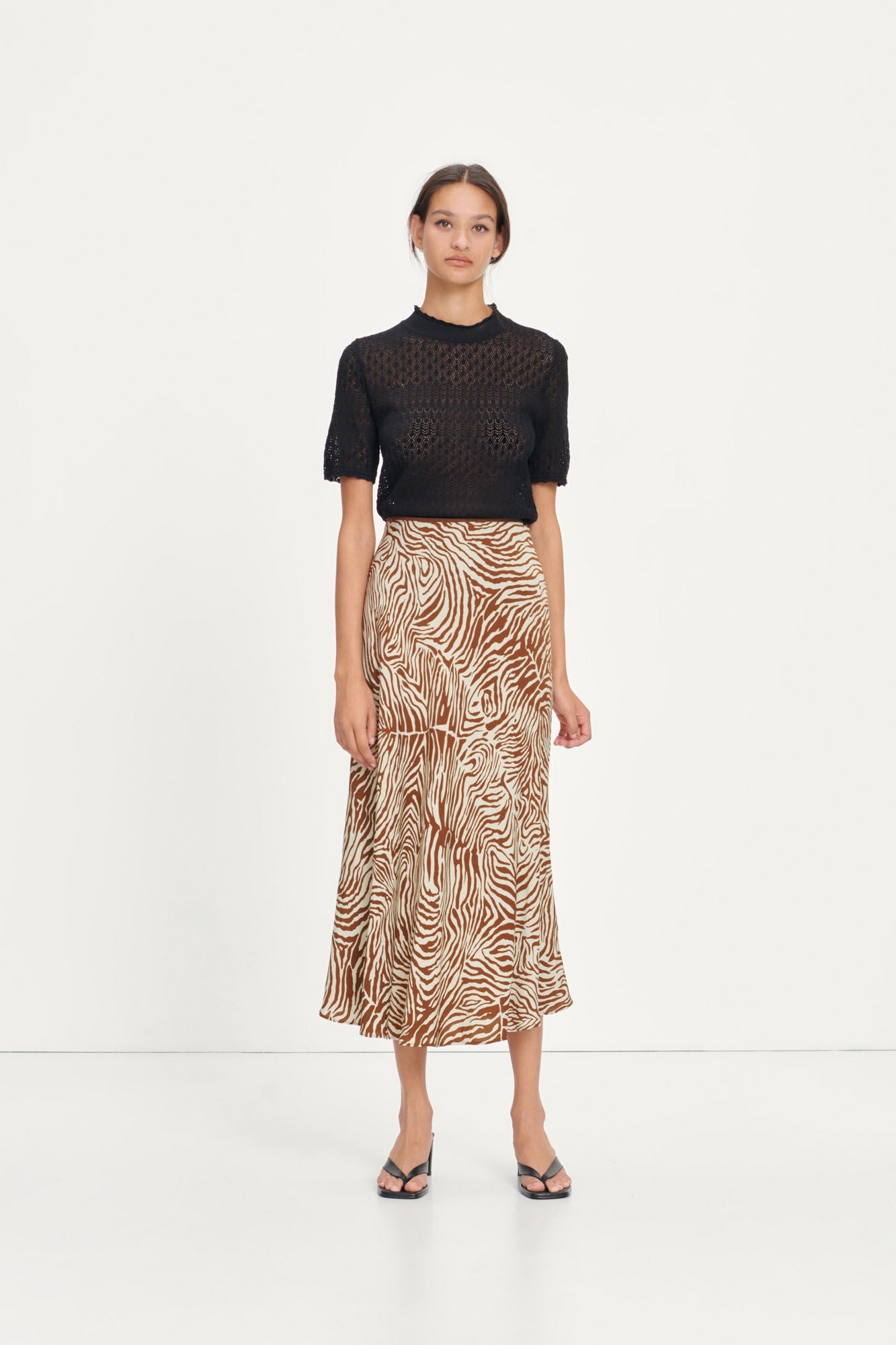 This midi skirt features an artwork print and has been cut on the bias to add fullness to this style and to showcase the pattern. An invisible zip fastens this printed skirt, which is finished with a stretch gross grain ribbon on the waist