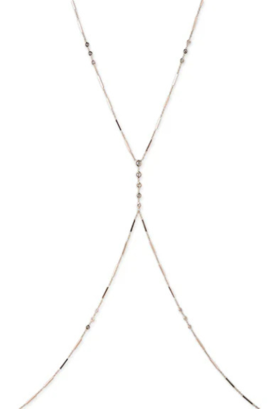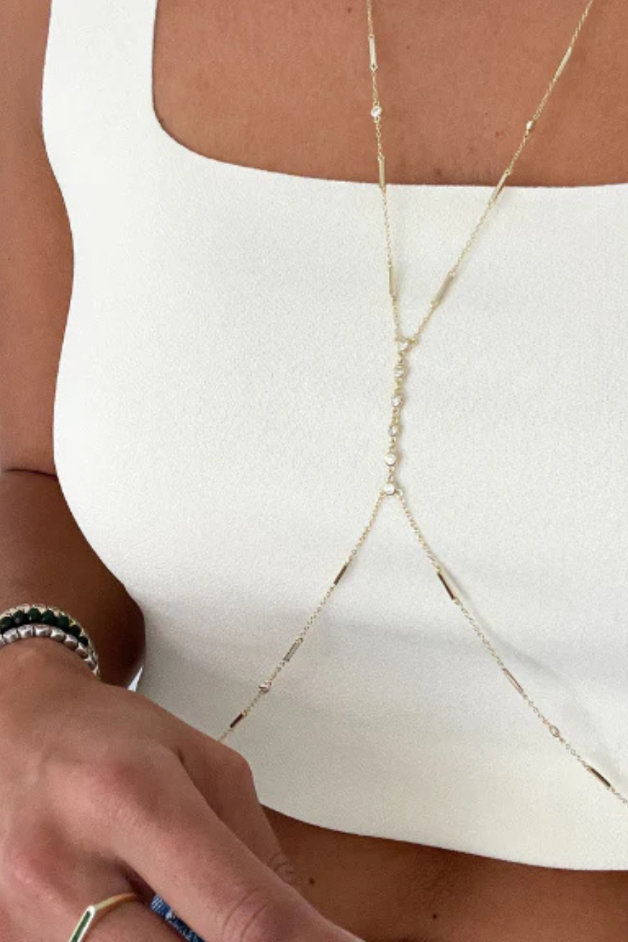 The Amalfi Body Chain was inspired by the Amalfi Coast's glistening beaches. The Amalfi Body Chain is the perfect summer accessory to wear with your bathing suit or a flow summer dress.