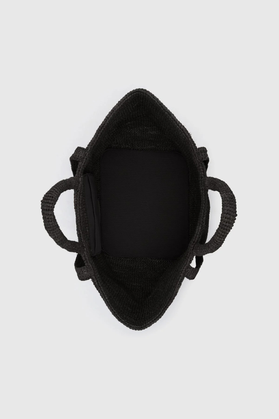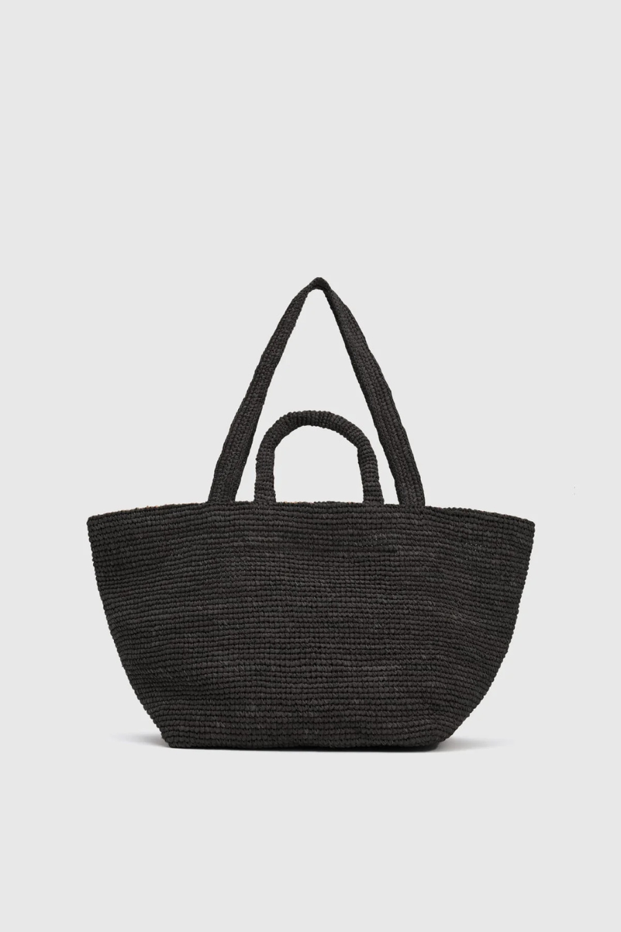 CAMILLA AND MARC Amir double-handled straw tote with embossed monogram logo. Faux leather base. Press stud closure.