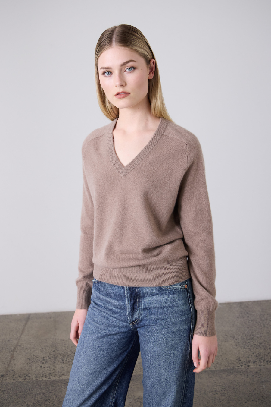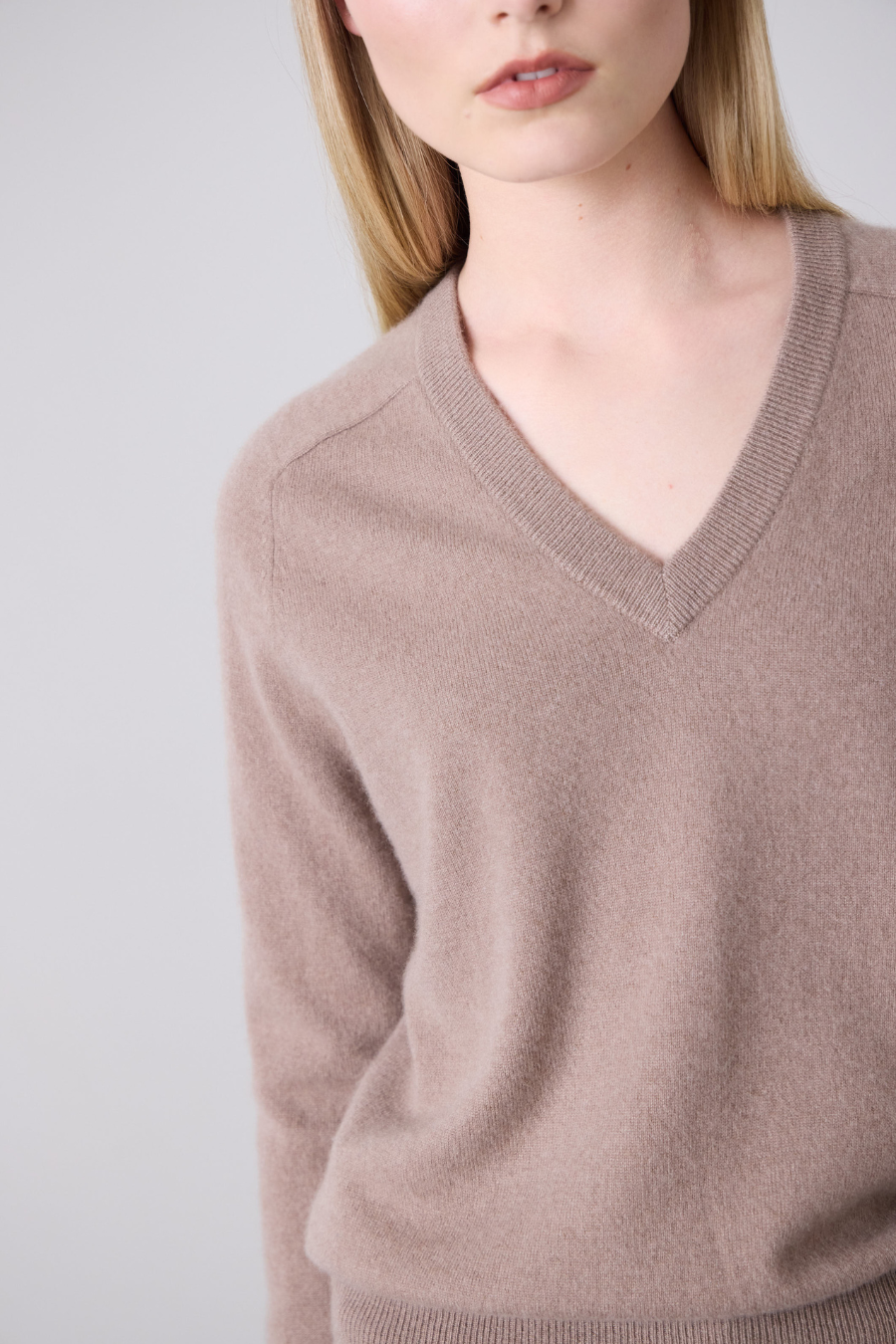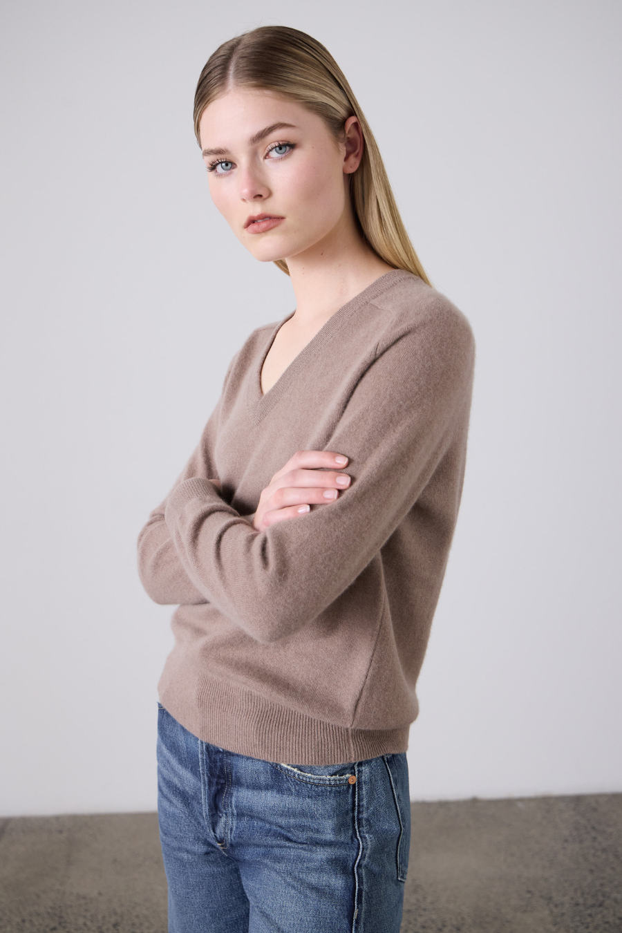 Our women’s cashmere V-neck sweater in mink is a timeless wardrobe essential. Made from soft, premium cashmere, it’s perfect for layering or wearing on its own. With a relaxed fit and effortless style, this cashmere V-neck is a versatile must-have for any season.
