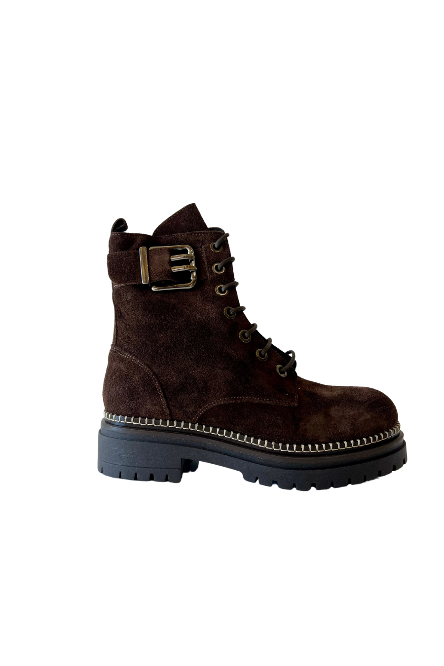Reminiscent of a traditional hiking style, the Anah Suede Boot is an elevated version with lace ups and a polished black nickel buckle. The rubber soles ensure maximum comfort and are hand stitch finished.