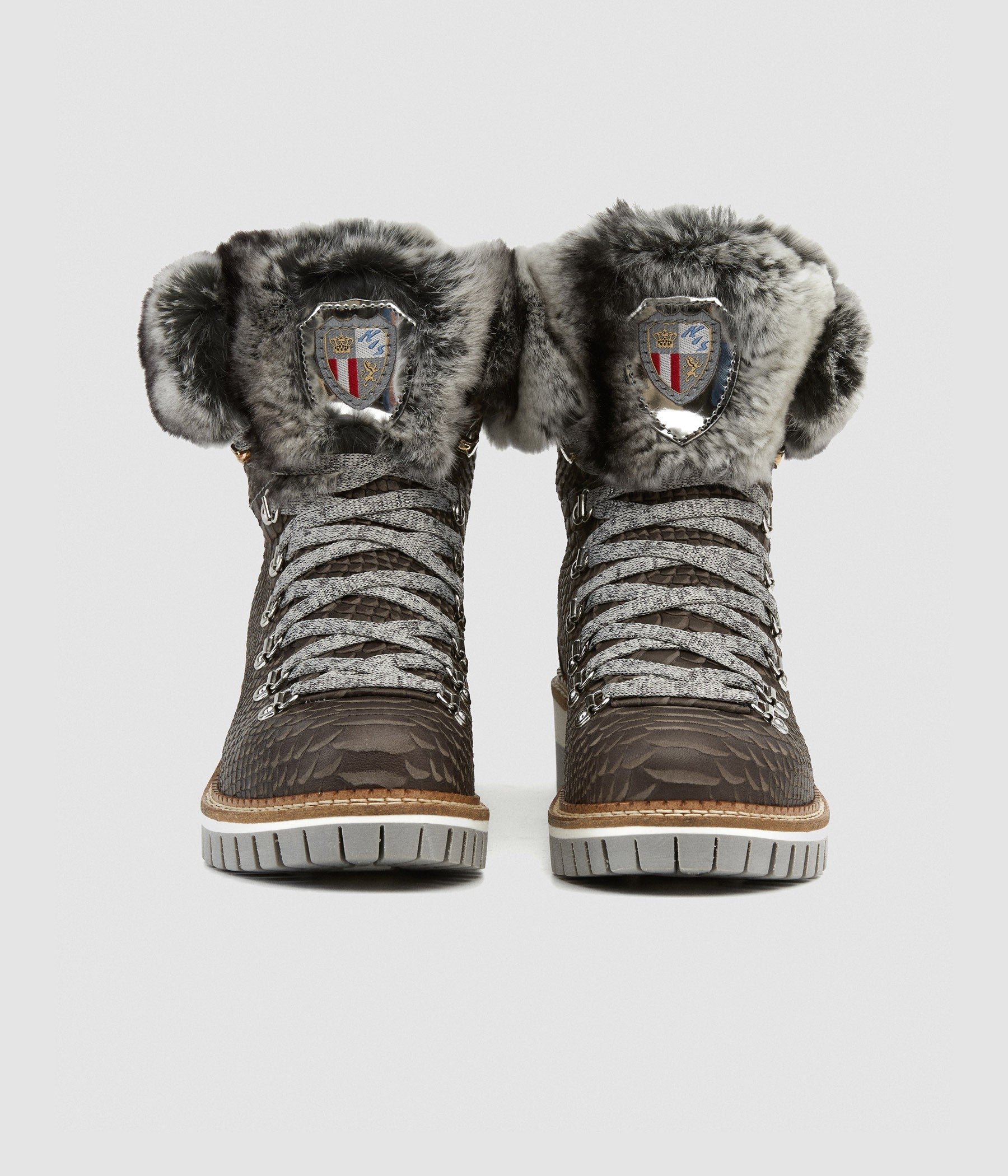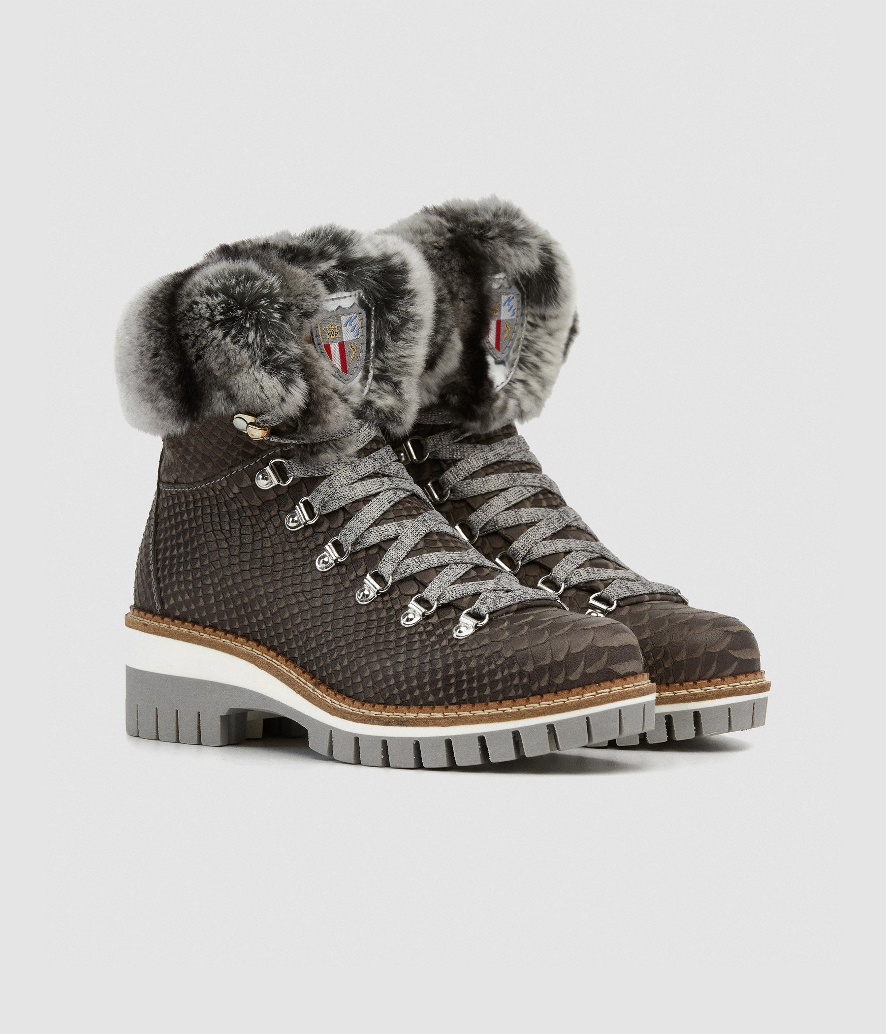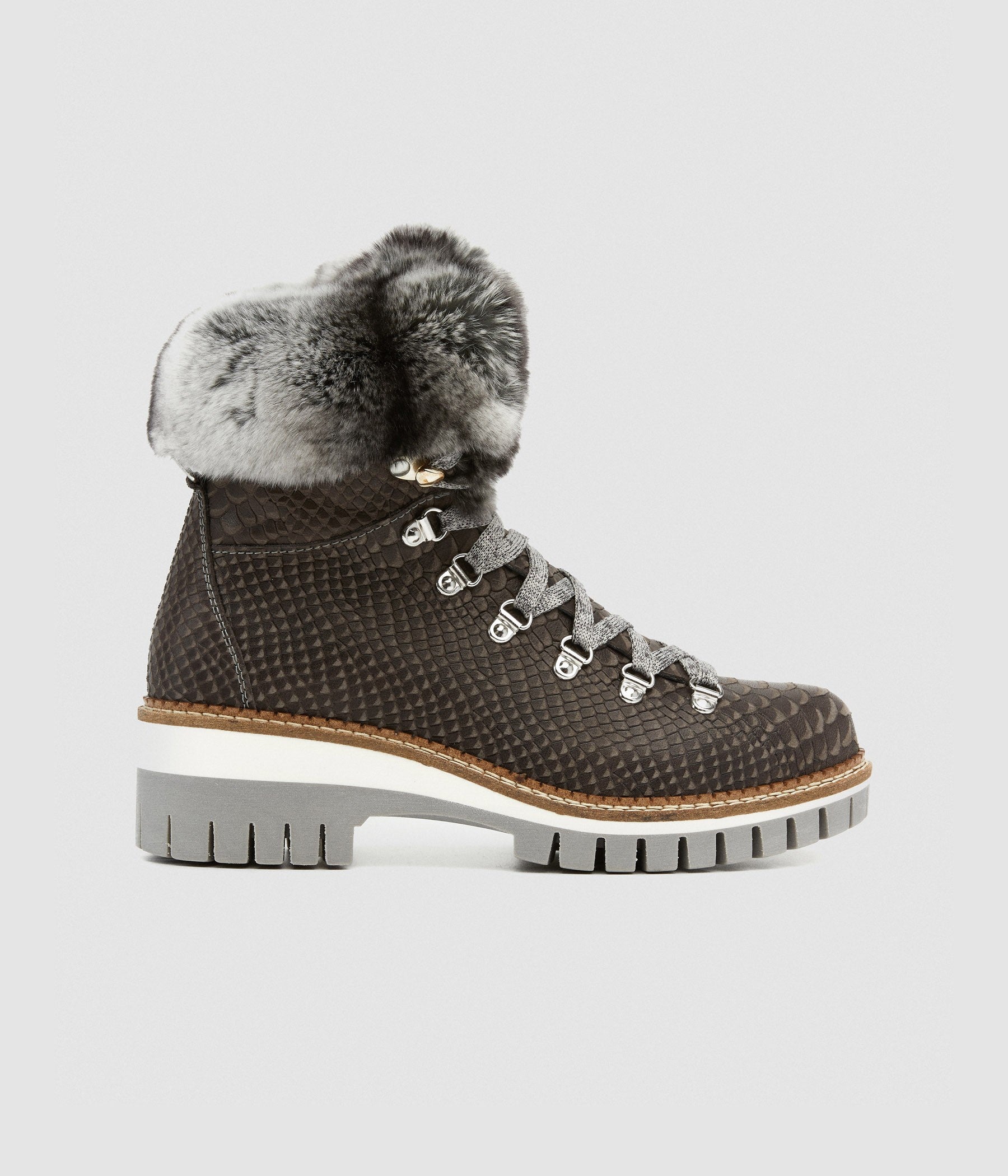Lace-up ankle boot in sophisticated black patent python print calfskin with finely glittered patches and white and grey lapin fur collar. Warm fabric lining and pure wool insole to keep your foot perfectly comfortable. The two-tone rubber sole with its solid 5 cm high heel ensures the perfect combination of stability and femininity. Comfort with style!