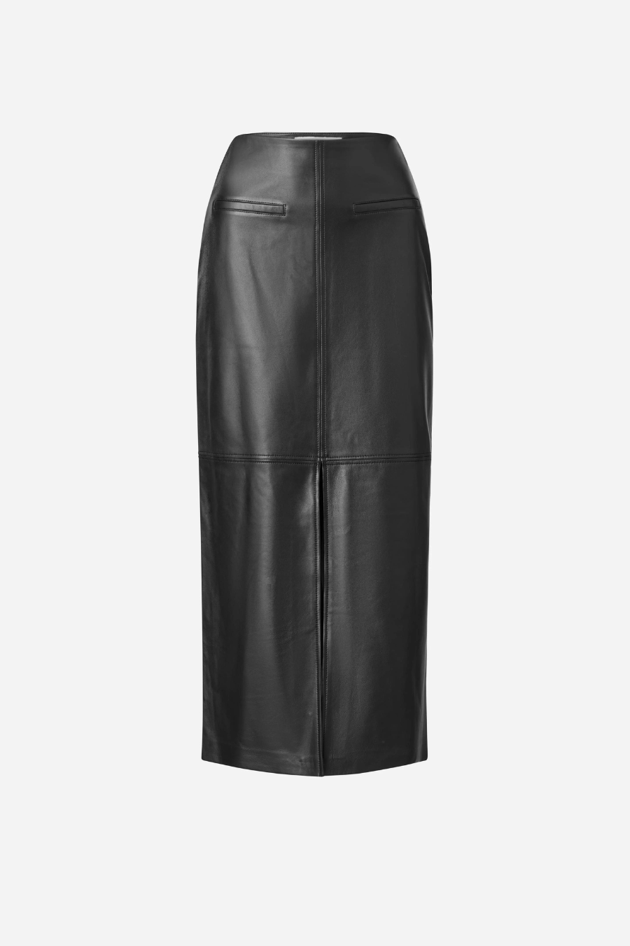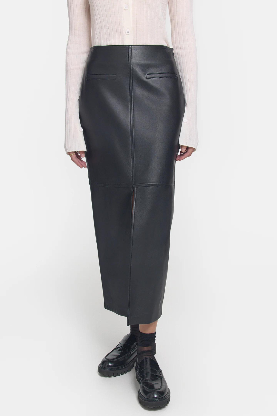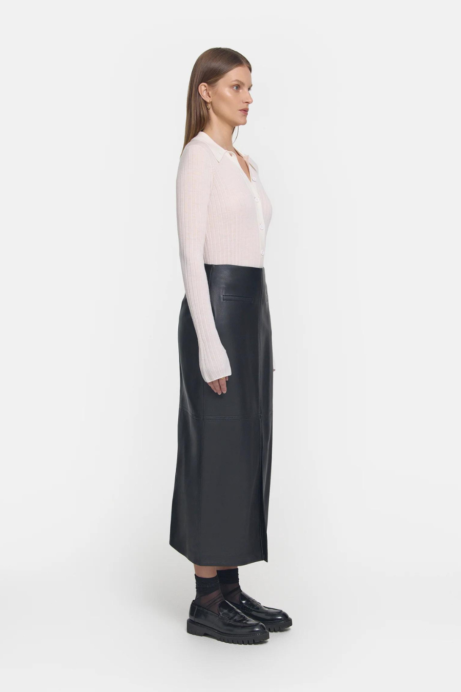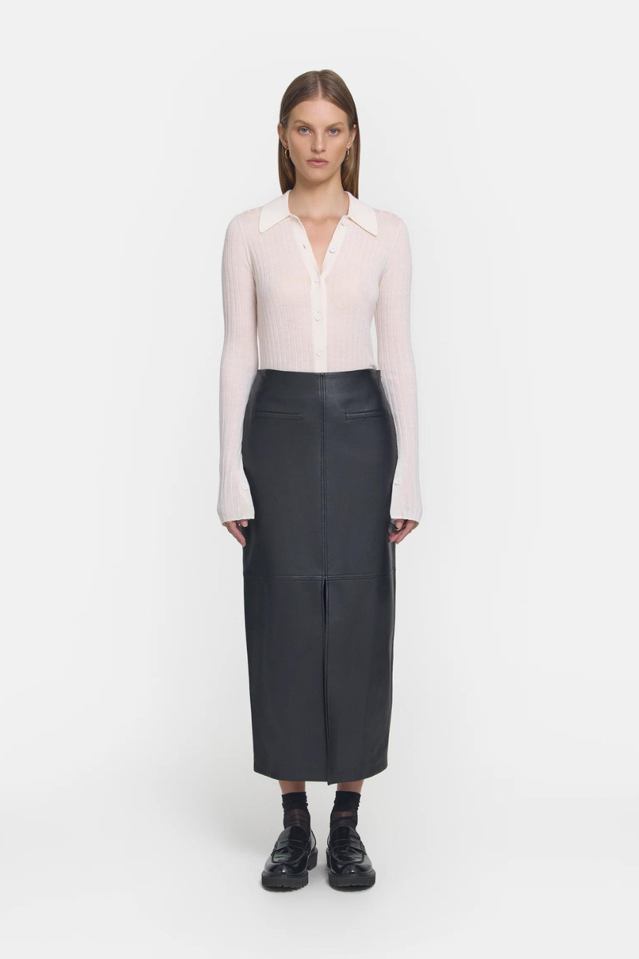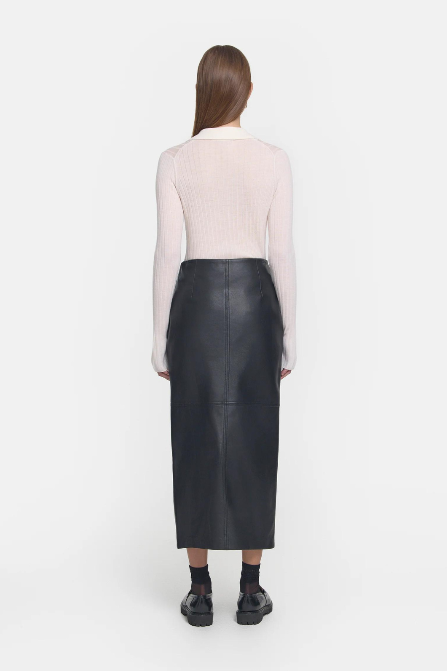Introducing the limited edition Antihero Leather Skirt, crafted from genuine Leather Working Group certified leather. This midi-length piece exudes edgy elegance with its front split detail and clean waist edge finish. Perfect to pair back with your wardrobe staples.