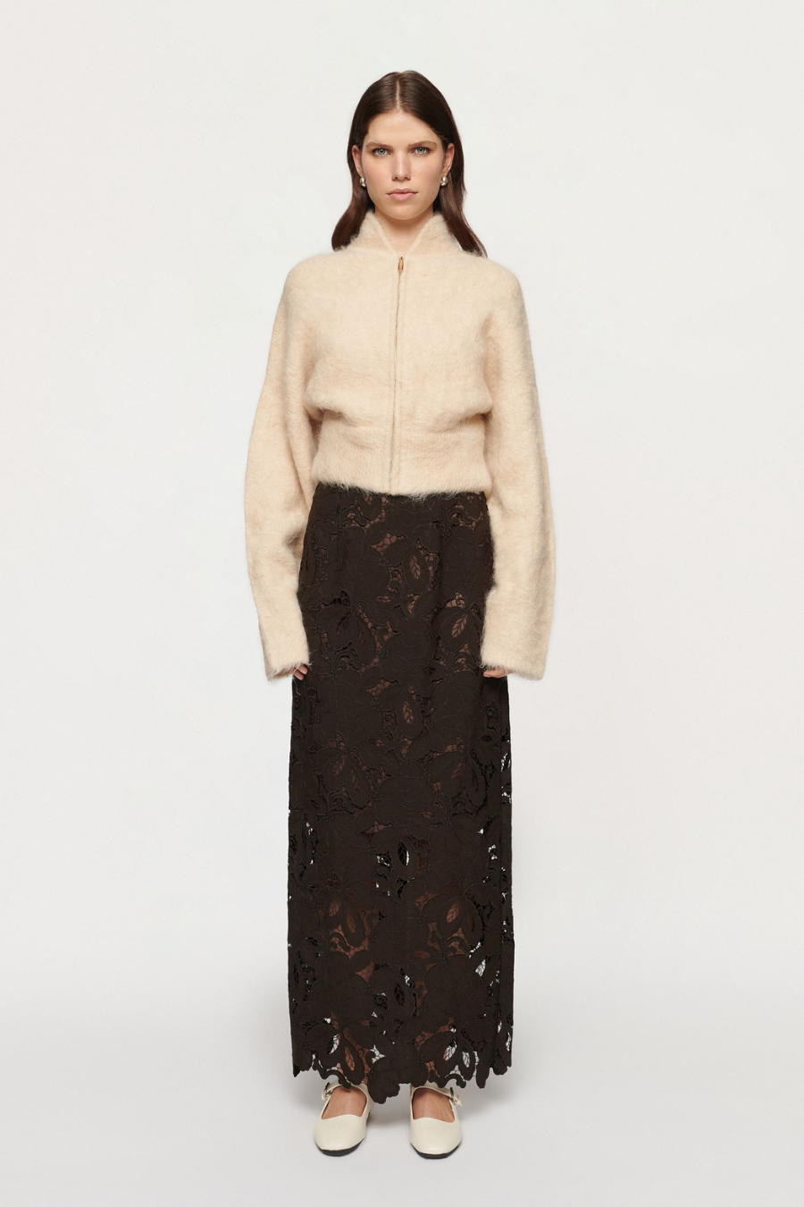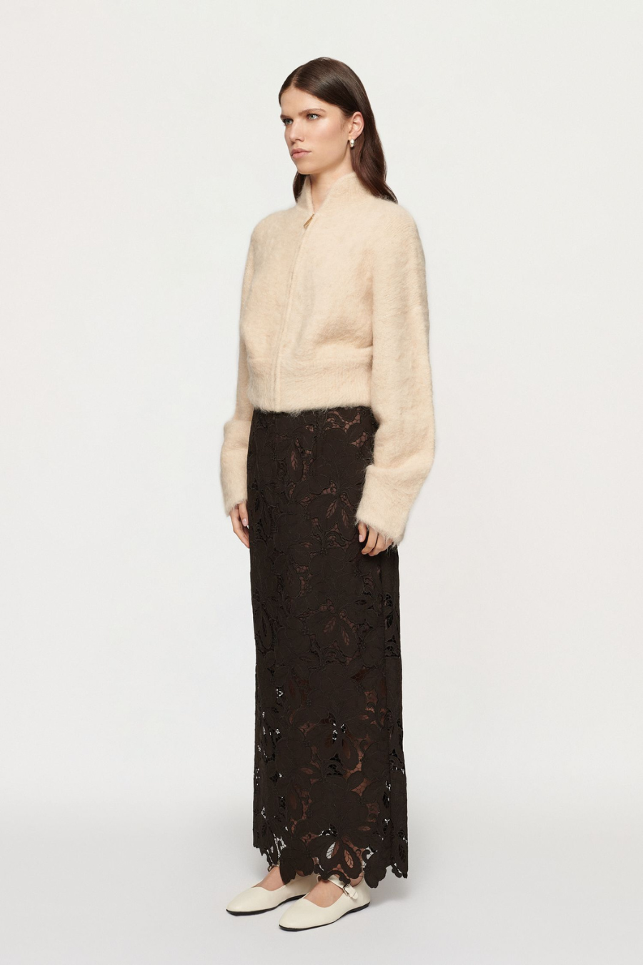 Beautifully crafted in a soft alpaca blend yarn the Archer Fluffy bomber has a warm and soft hand feel with a brushed surface texture. Boasting a high collar, a deep hem band, and elegantly rounded sleeve shapes, this bomber exudes sophistication. Finished with a heavy gauge metal zipper and bespoke rounded zip puller in soft gold, this elevated bomber blends comfort and style seamlessly.