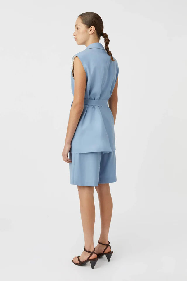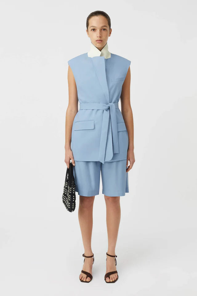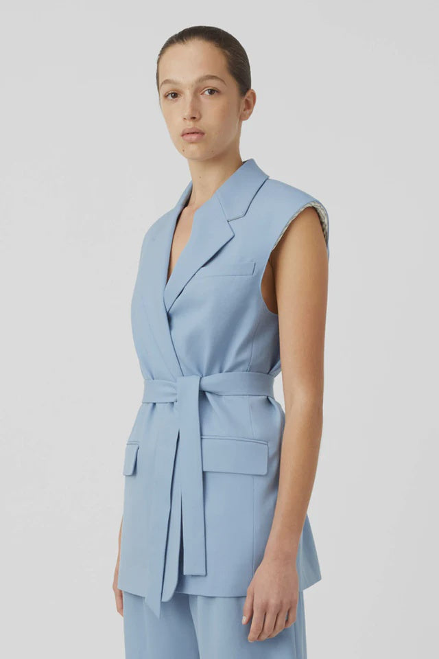 The Atlantis Blazer Vest is a refined addition to any wardrobe, crafted from wool for a luxurious feel and relaxed fit. It features a peaked collar and lapel with a contrast under collar, offering versatile styling options. The vest is elegantly tied with a self-tie waist belt and detailed pick stitching, adding a touch of meticulous craftsmanship to its design.