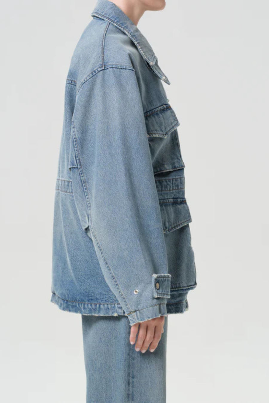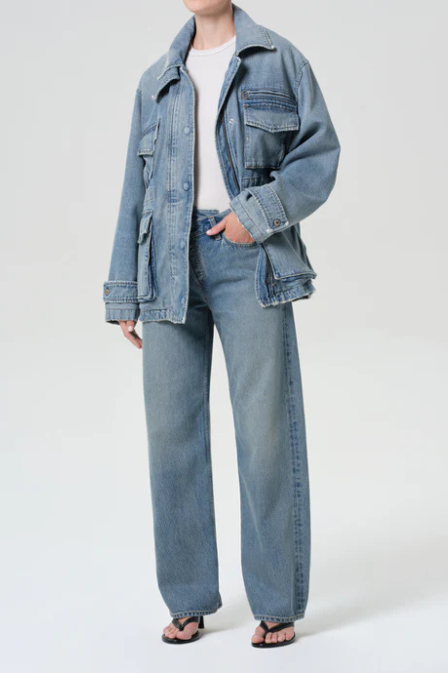 Looks Like: Medium tinted vintage indigo versatile utility jacket with oversized pockets and drawcord