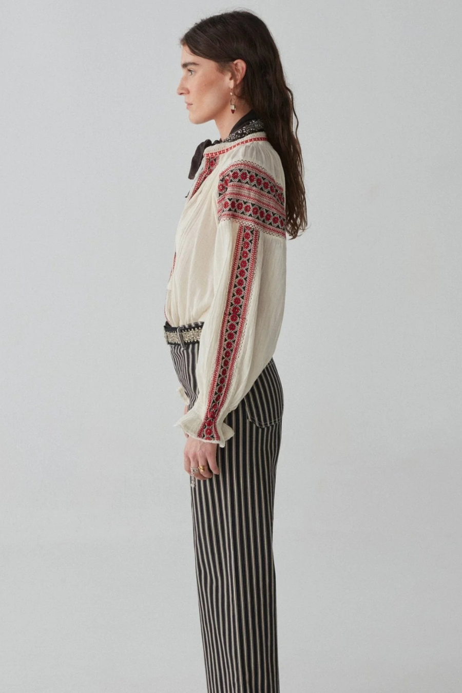 Crafted from soft cotton, this blouse features striking red and black embroidery that runs unapologetically along the front, sleeves, and cuffs. The intricate geometric patterns bring a bold contrast to the soft, flowing fabric, creating a piece that’s as daring as it is detailed.