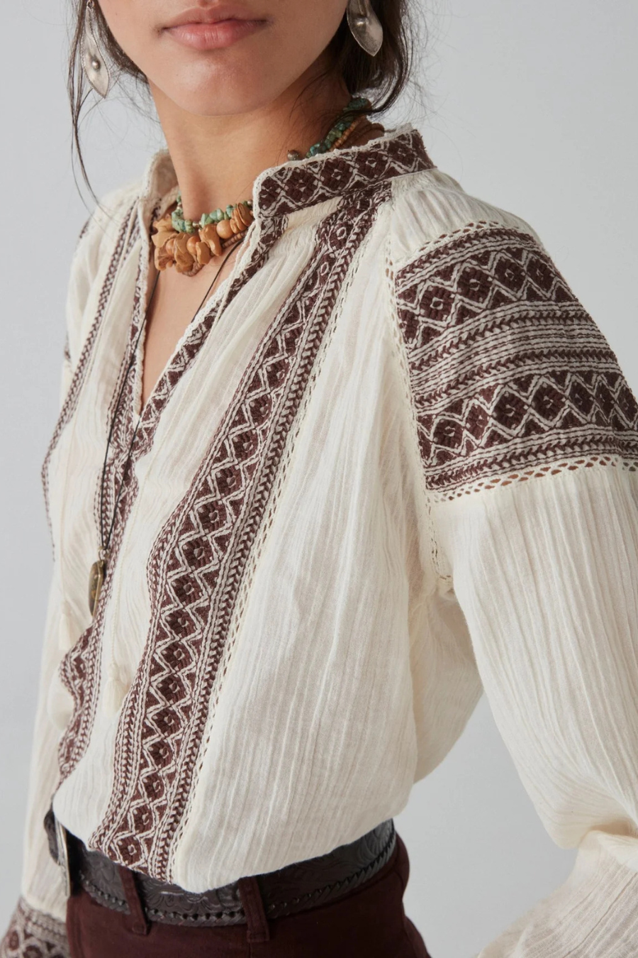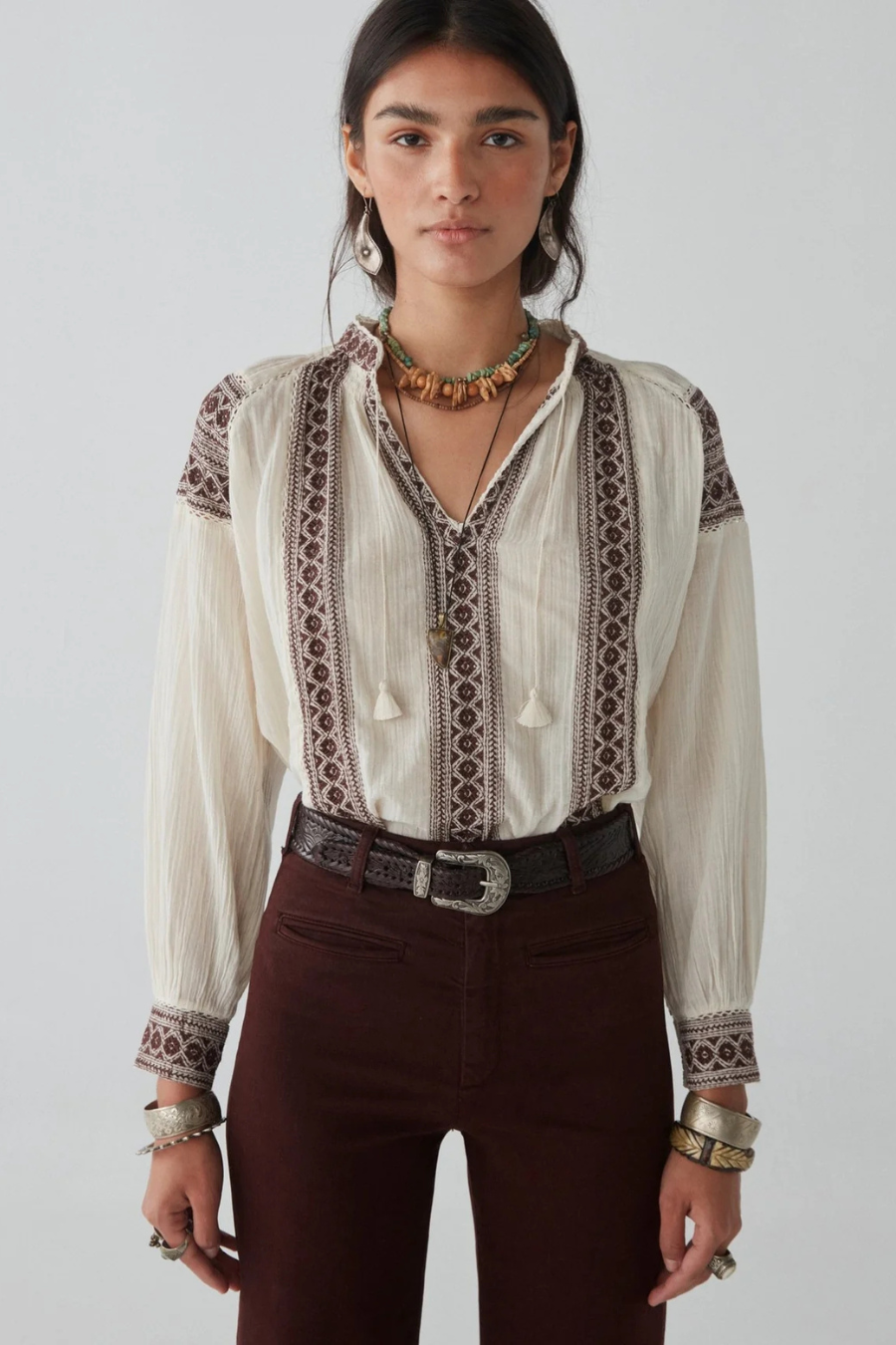 One of our most emblematic patterns is back. Now in 100% cotton white guaze,the blouse features dye-to-match lace inserts, sublime string-tassel-pompom combo, and embroidery details across the front, sleeves and cuffs.