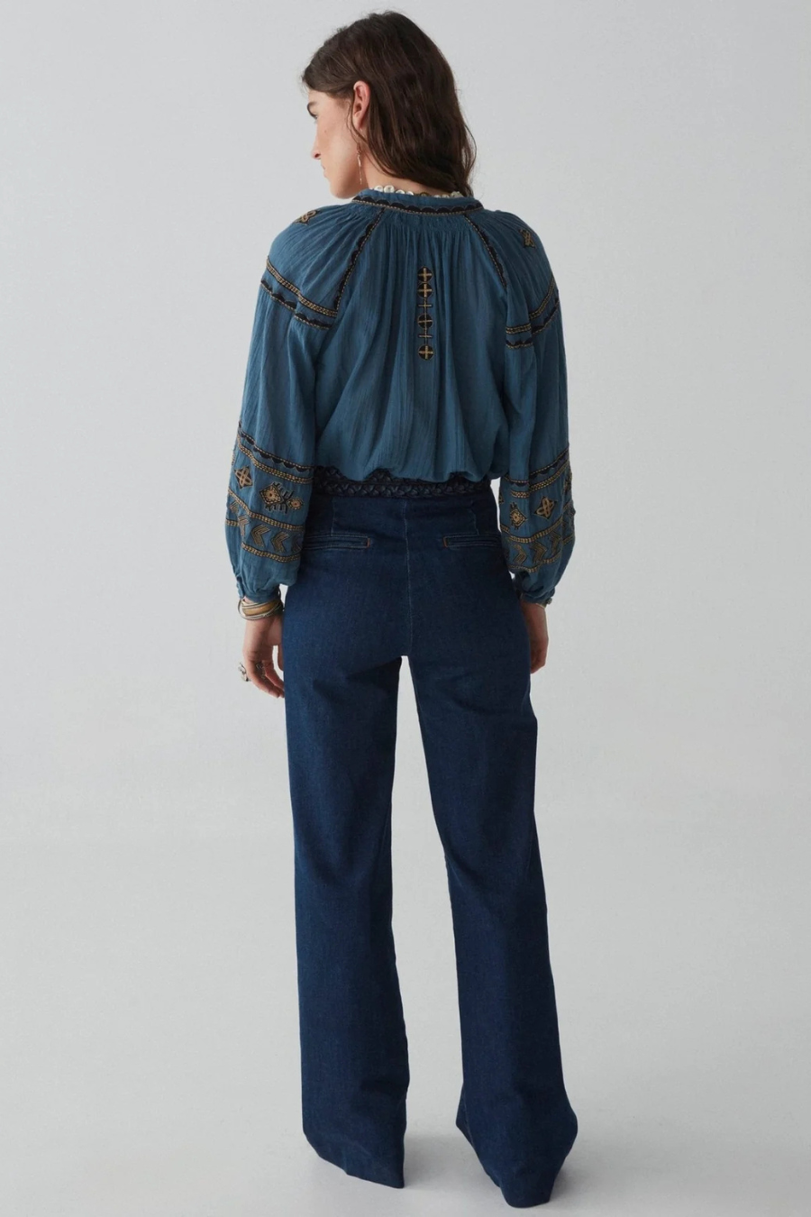 The Di Pinto di Blu Blouse isn’t just a garment; it’s a statement of fearless style. The golden embroidery shines against the deep, rich blue fabric, creating a striking contrast. The patterns woven across the front, sleeves, and back blend traditional artistry with a modern twist. Tassel accents bring a hint of playfulness.