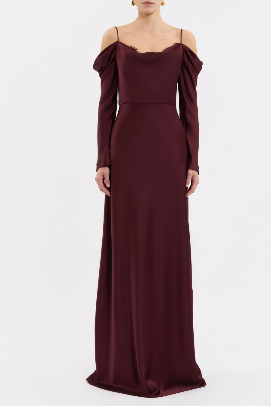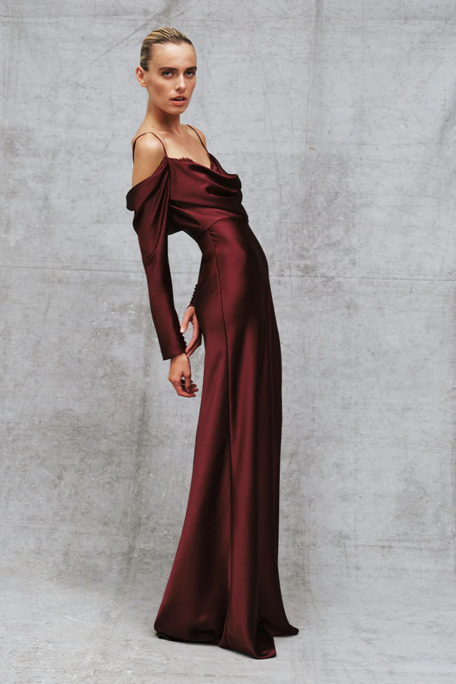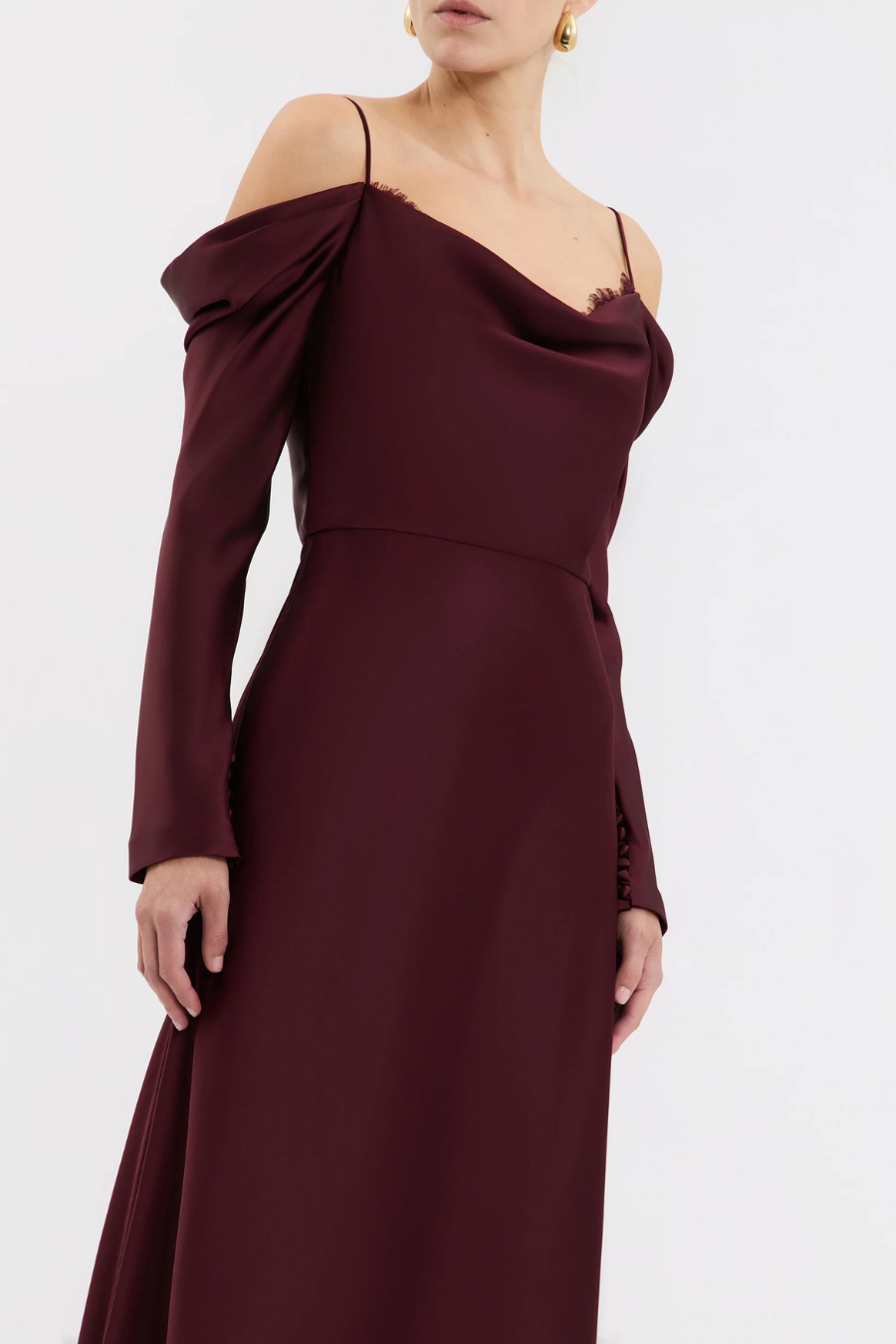 The Avalon Gown in wine epitomises feminine elegance, highlighting a refined lace trim underlay for a touch of allure. Its bias-cut slip silhouette flows effortlessly, complemented by draped long sleeves and a soft cowl neckline, supported by adjustable spaghetti straps for added comfort. Polished and refined, the gown is finished with self-covered buttons and an invisible side zip fastening for a flawless fit.