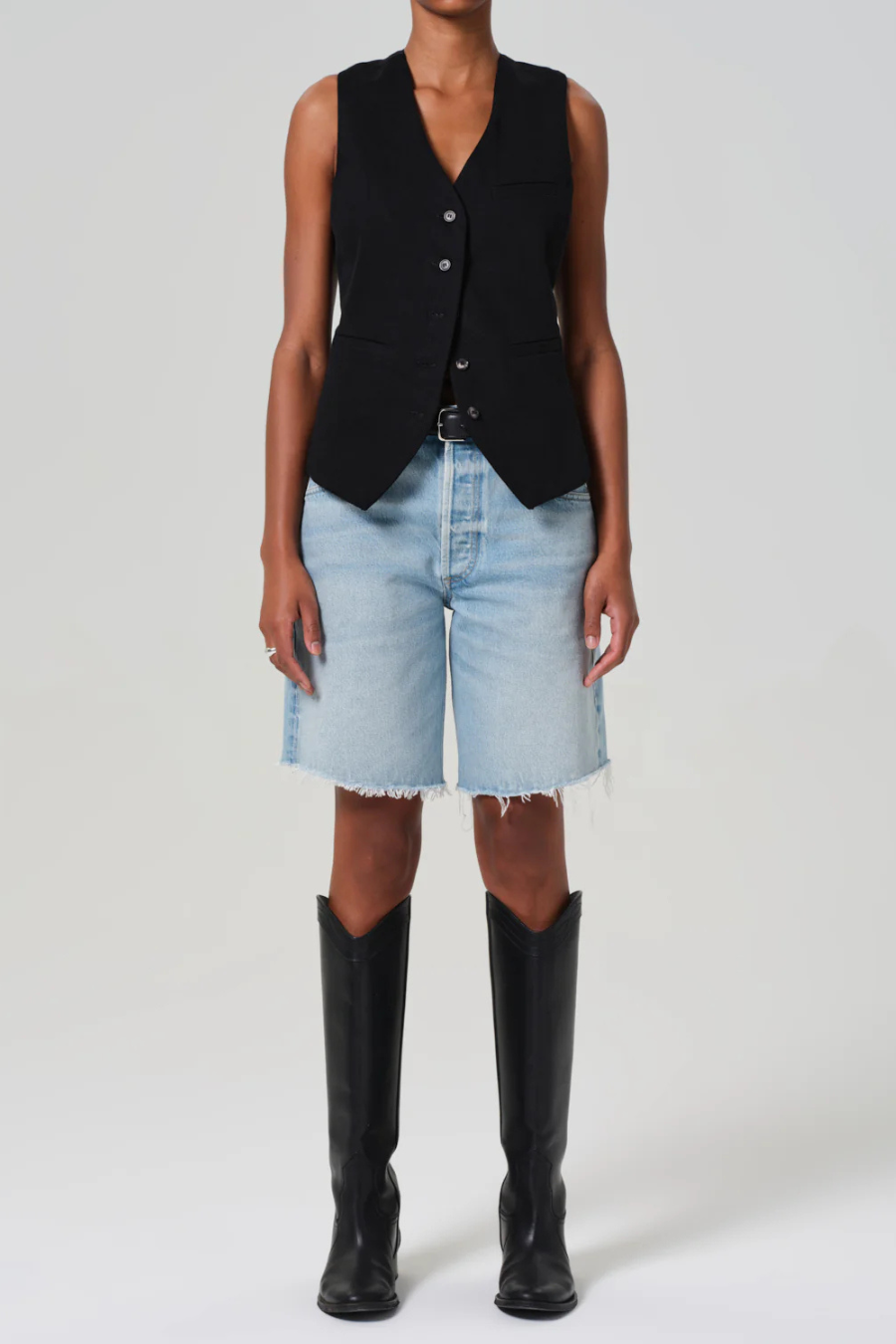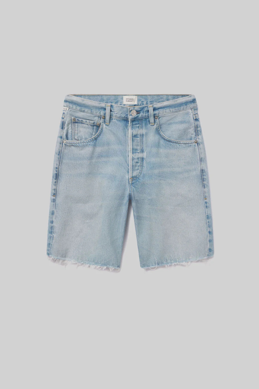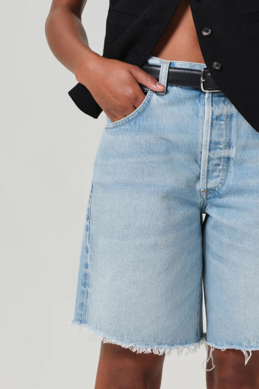 Looks Like: Light indigo short with raw hem and a longer inseam