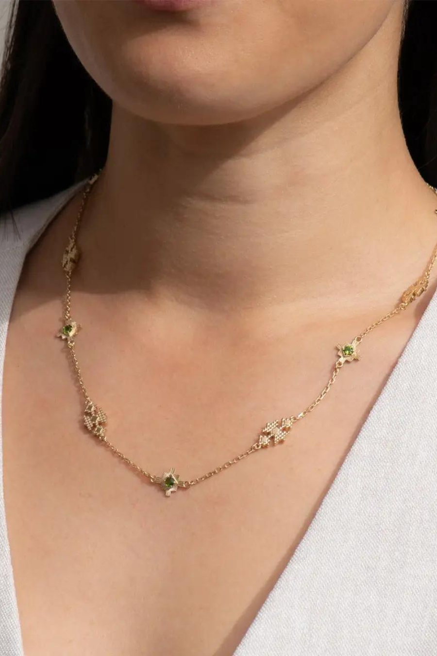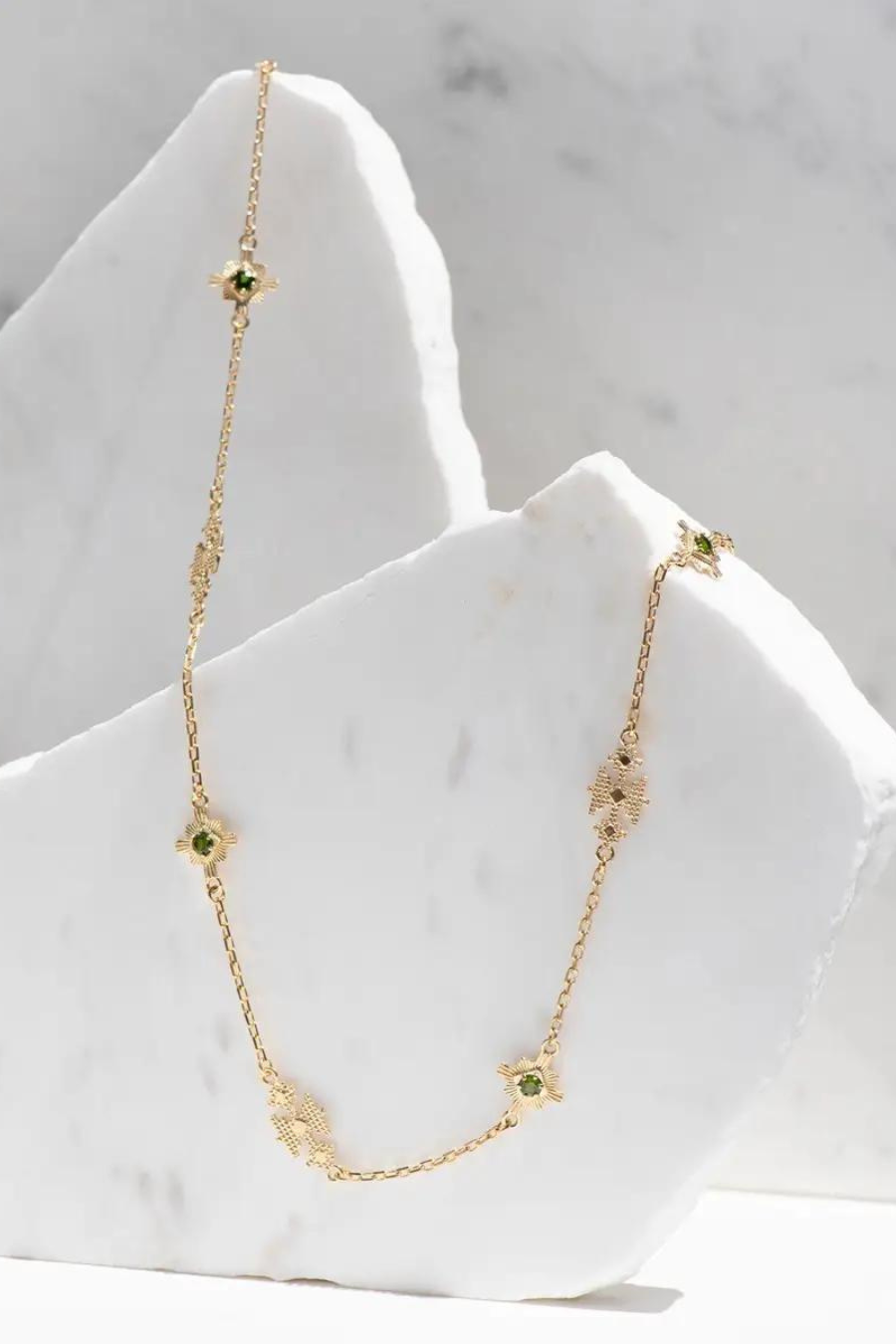 Each component serves as a reminder of the bonds that unite us. The Chrome Diopside stone is said to be connected to the heart chakra and nature which is fundamental to Zoë & Morgan's heart and core.