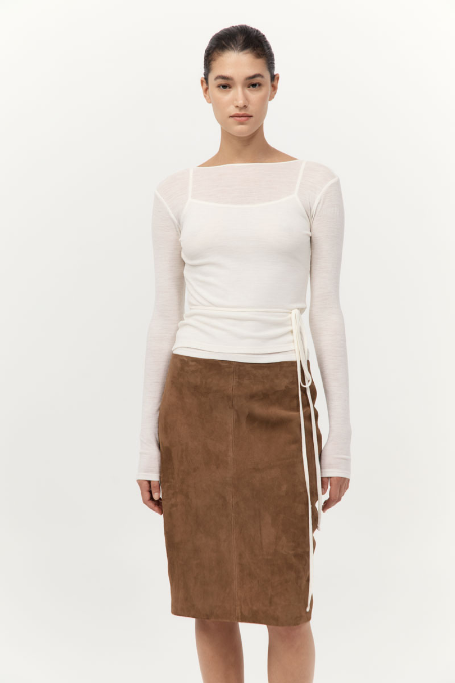 Crafted from 100% merino wool, the Baby Wool Wrap Top wrap top features a flattering Vneckline, long sleeves, and a wrap front with tie fastening. With its fine ribbed texture and subtly sheer finish, the Baby Wool Wrap Top is ideal for layering or wearing on its own.