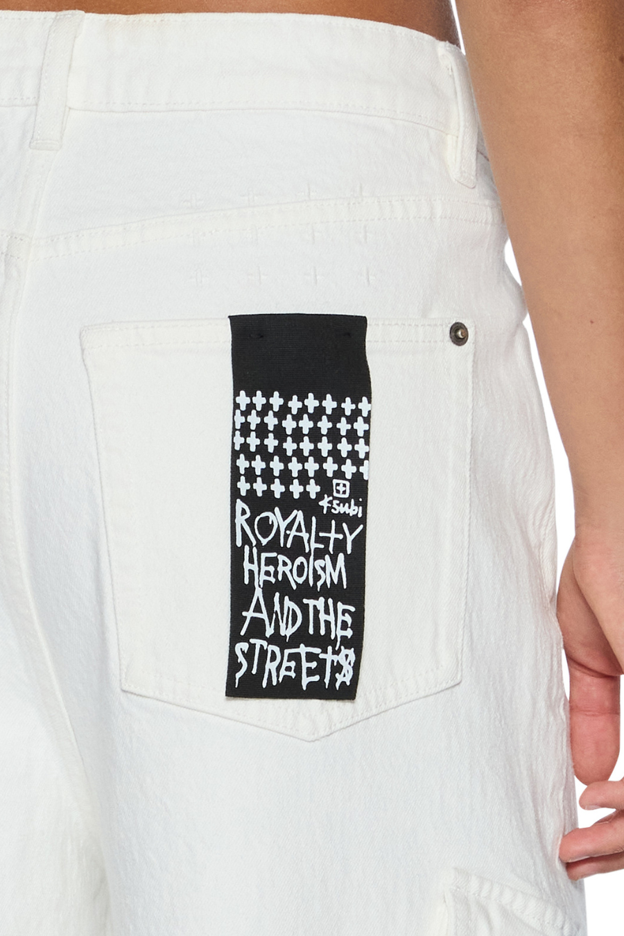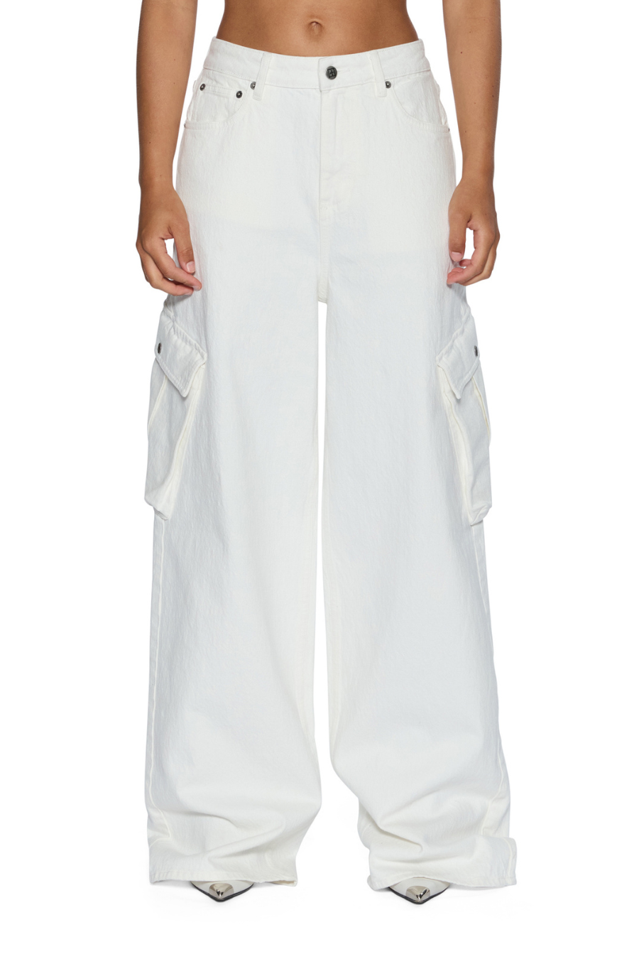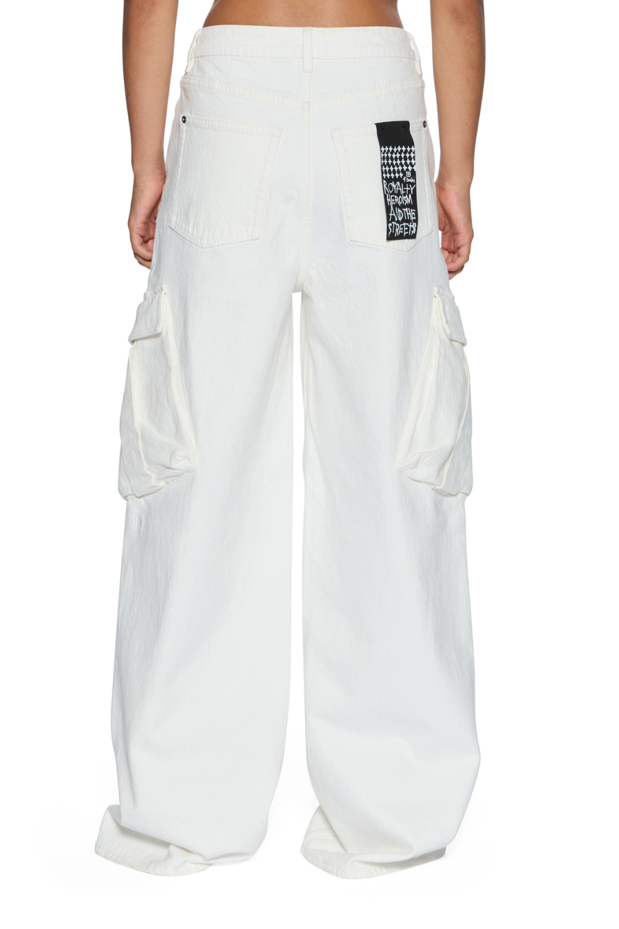 Relaxed wide leg jean with a mid rise. Made from a premium Ecru denim with a tonal top stitch. Designed with longer-length to stack stylishly above the ankle. It features side facing angled cargo pockets, classic five-pocket styling with Ksubi branded hardware, T-box and 3x4 embroidery, removeable pocket tag attached to wearer's right back pocket.
