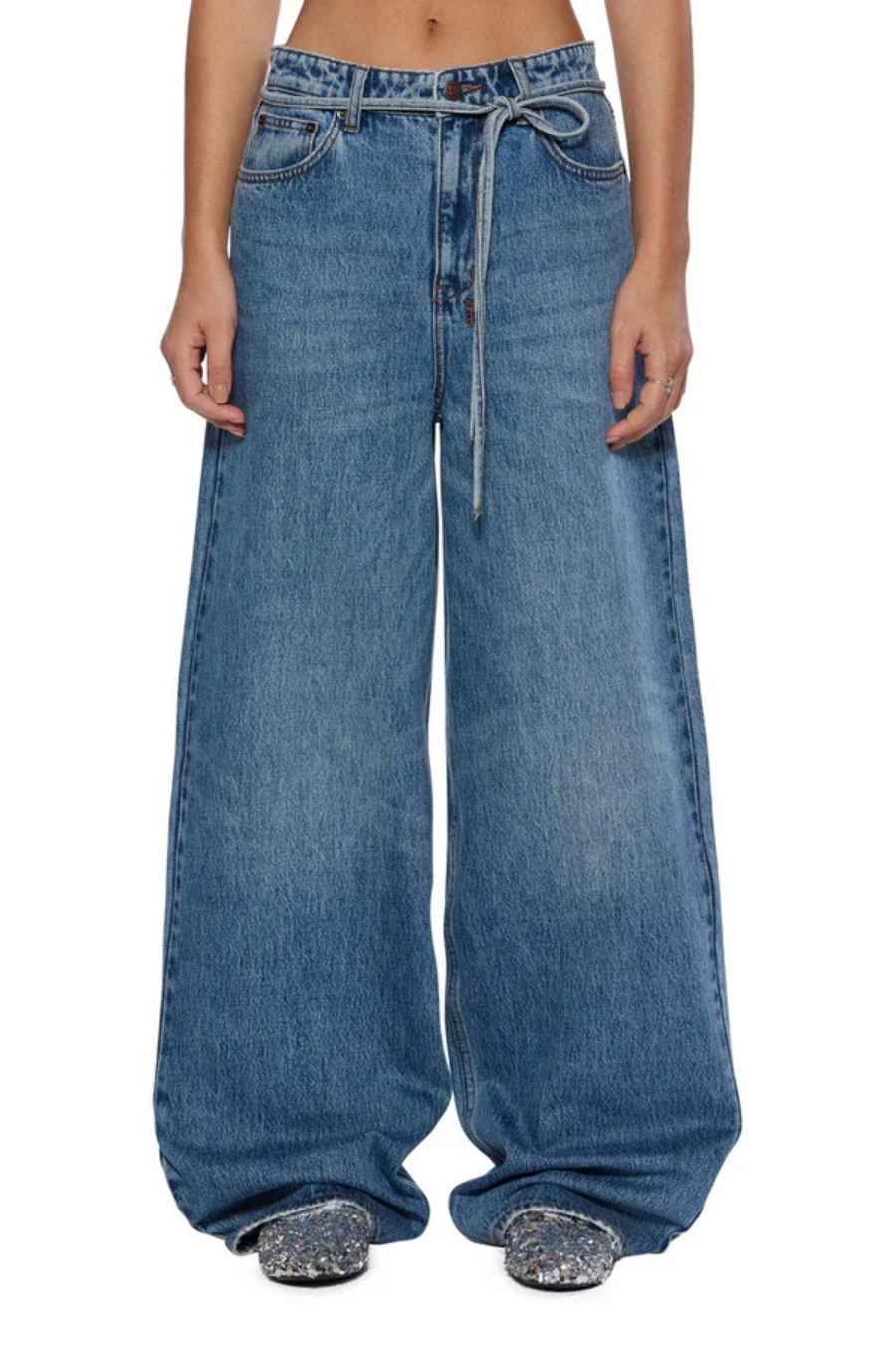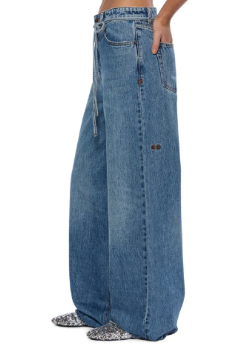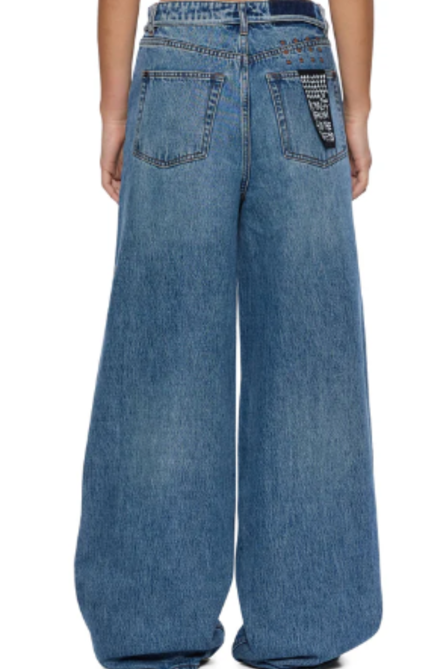 The Baggy Jean Relik is a relaxed wide-leg jean with a mid-rise and a detachable shoelace-style belt. Made from premium rigid denim in a mid-blue shade with an enzyme wash and neutral tint, it features subtle grinding at the waistband, pockets, and hem for a worn-in look. Designed with a longer length to stack stylishly above the ankle, it includes classic five-pocket styling, anti-copper Ksubi branded hardware, t-box and 3x4 embroidery, and a removable pocket tag attached to the wearer's right back pocket.