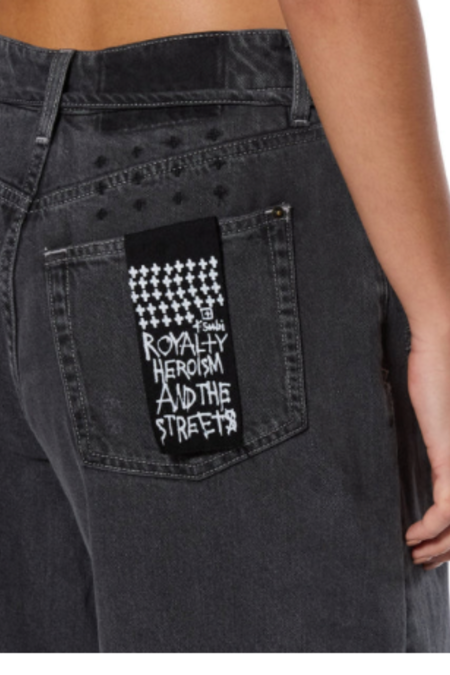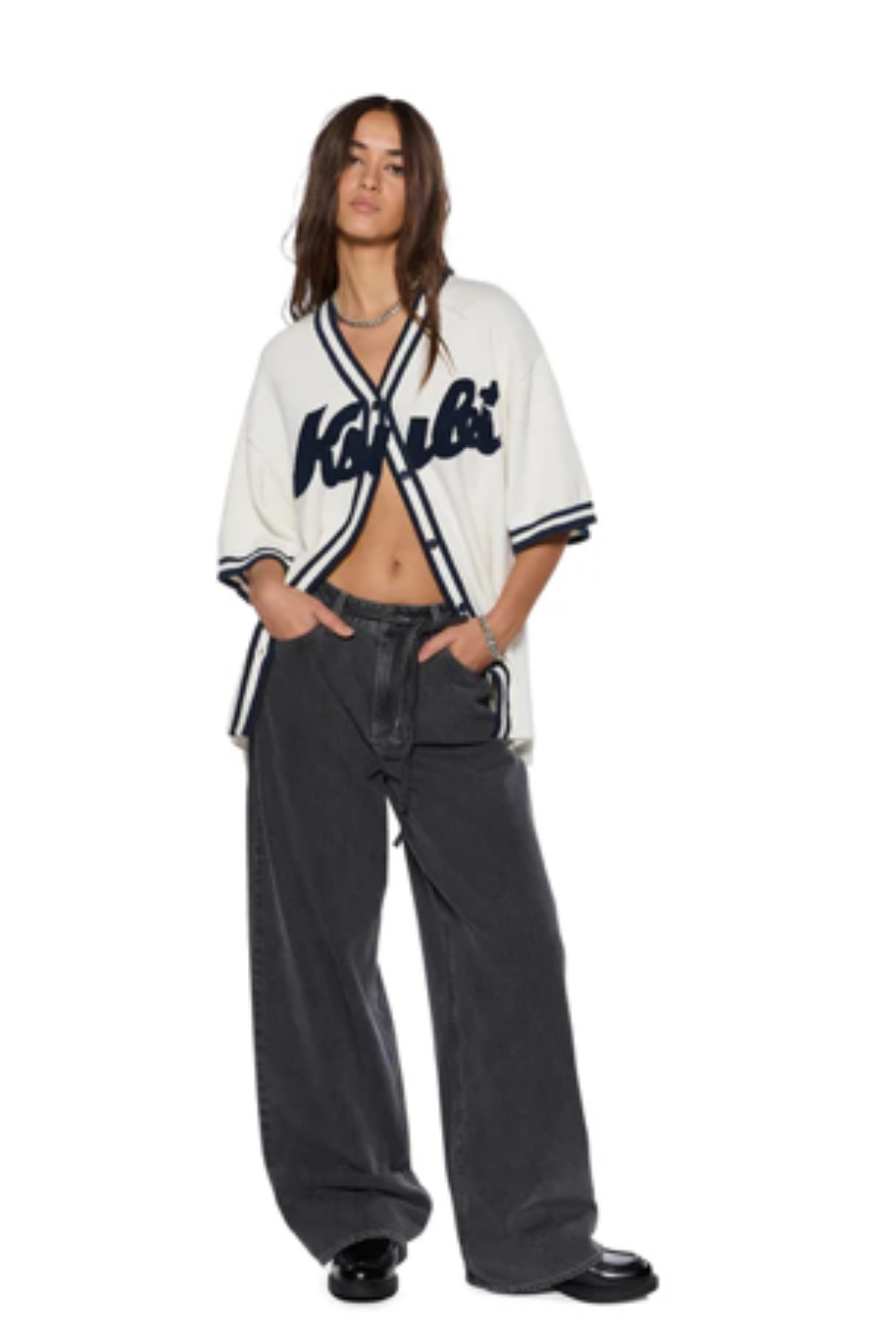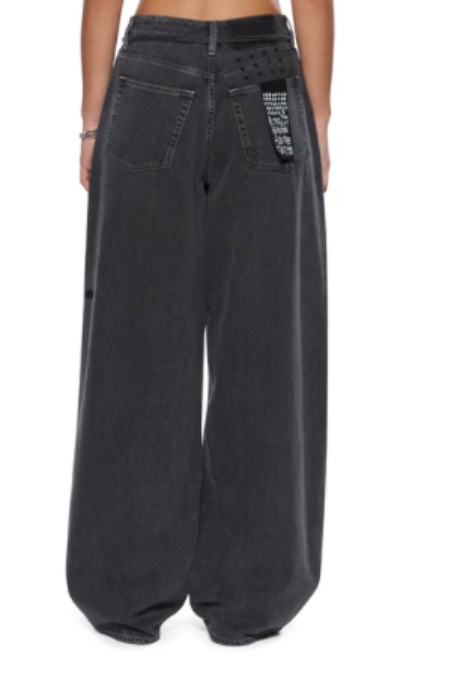 The Baggy Jean Shade is a relaxed wide-leg jean with a mid-rise and a detachable shoelace-style belt. Made from premium European rigid denim in stonewashed faded black, it features grinding at the waistband, pockets, and hem for a distressed look. Designed with a longer length to stack stylishly above the ankle, it includes classic five-pocket styling, anti-copper Ksubi branded hardware, t-box and 3x4 embroidery, and a removable pocket tag attached to the wearer's right back pocket.