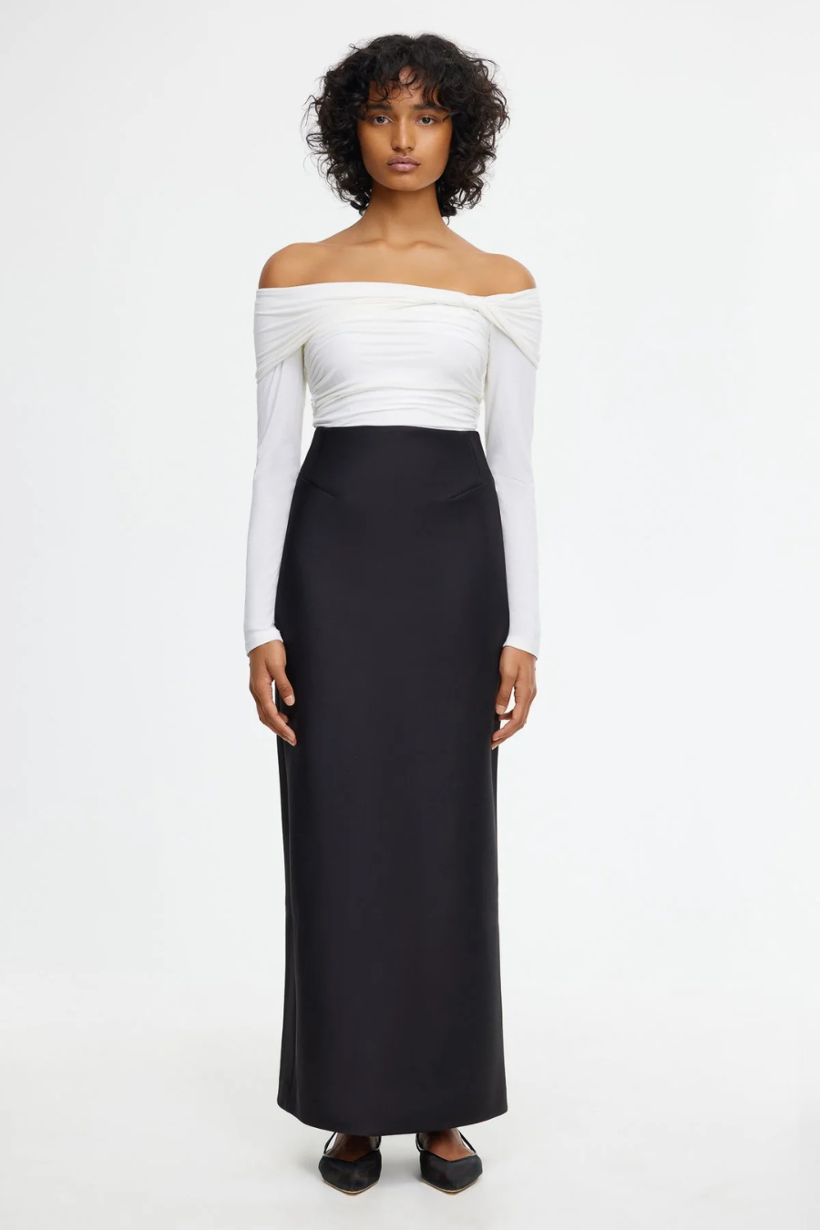 Introducing the Balderstone Skirt in Black, a versatile wardrobe essential crafted from long fitted bonded fabric. This high-waisted skirt features a centre back split and a centre back invisible zipper opening for a seamless fit. Effortless to style, it offers a flattering silhouette that can be dressed up or down with ease.