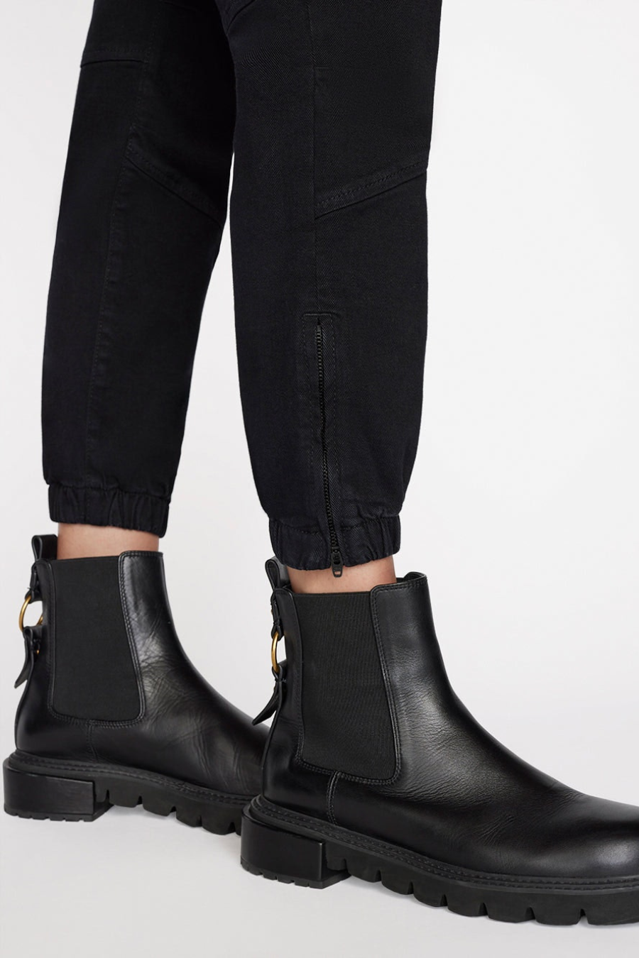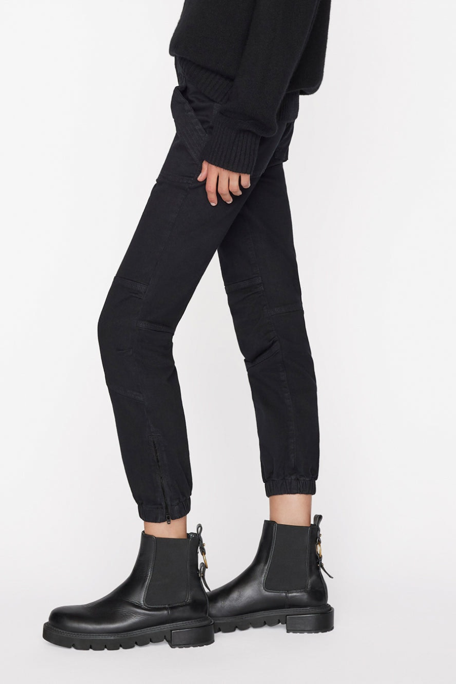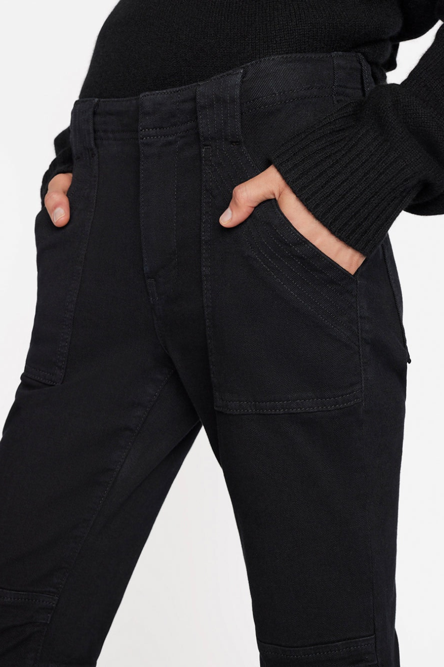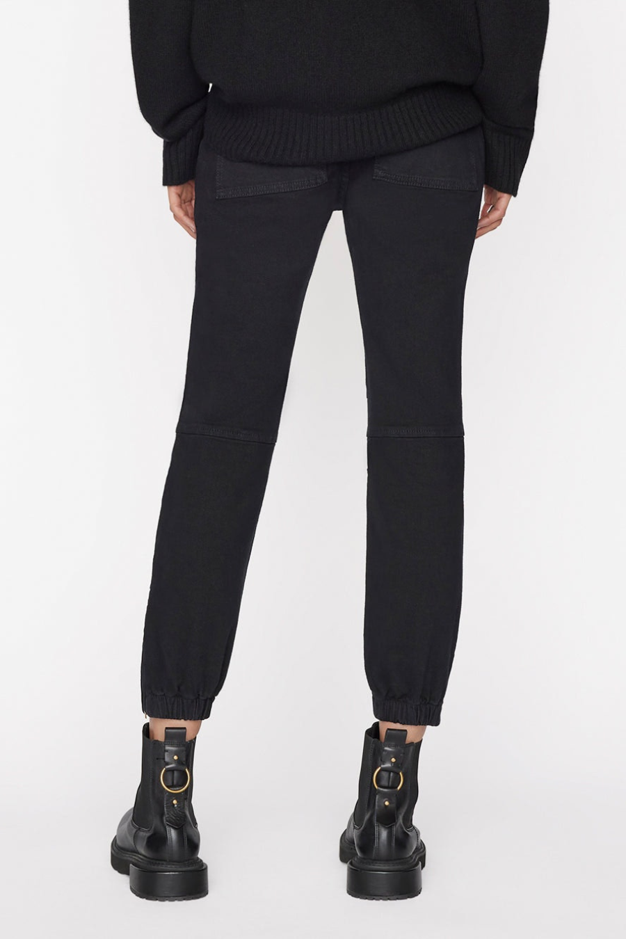 Rejoice, the famous FRAME Trapunto pant now comes in supersoft overdyed black denim. Featuring cargo pockets and banded bottom hems, this relaxed moto pant has utilitarian zippers at the ankles and deep slant side pockets. Pair yours with ribbed knits, silk tops, and your favorite tee.