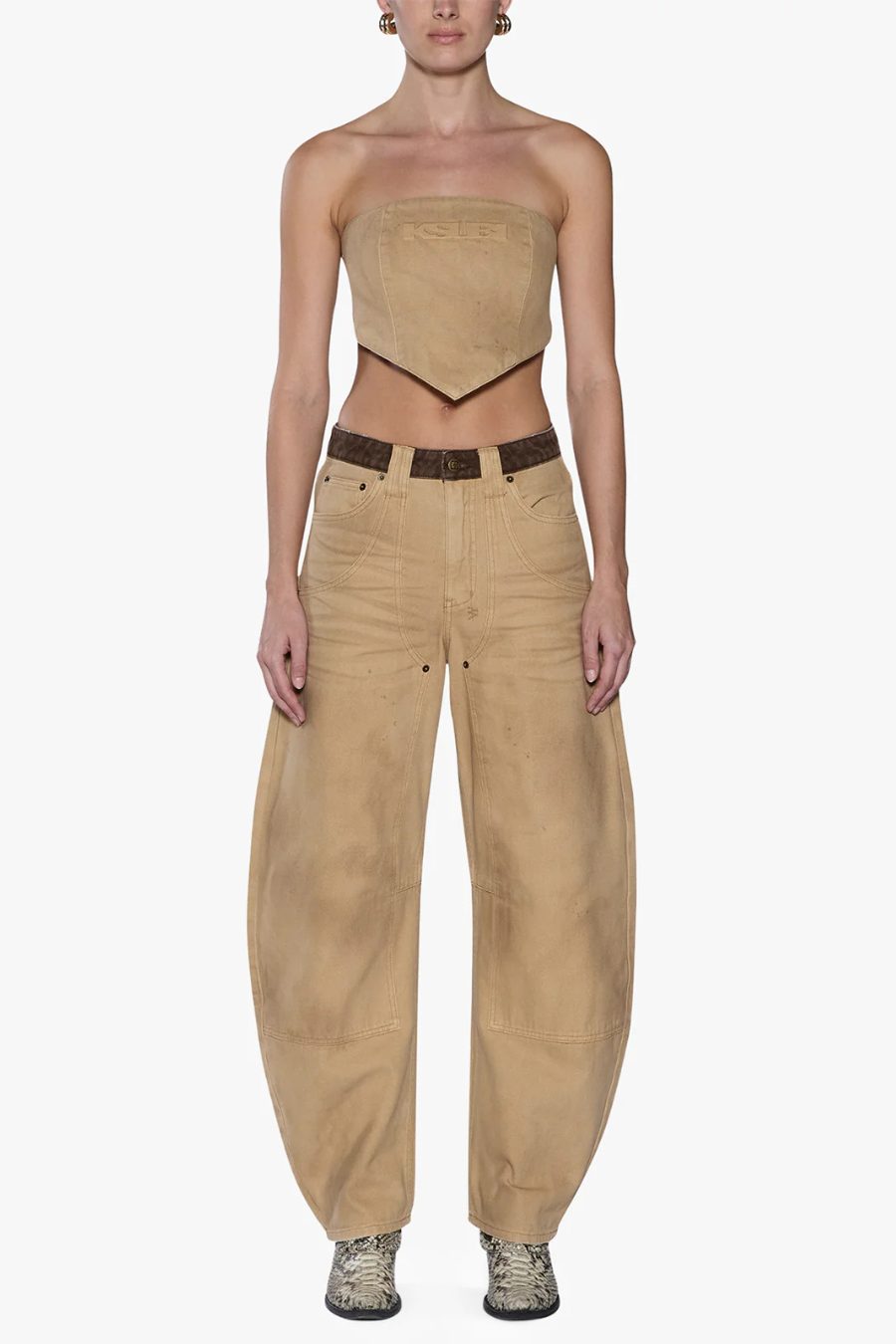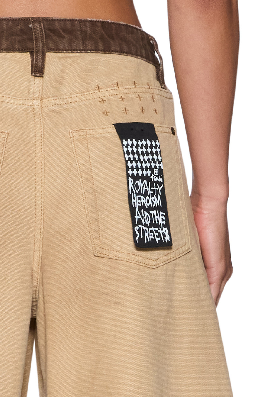Crafted from heavyweight 100% cotton nailhead canvas in an overdyed tan colourway, this mid-rise jean features a relaxed fit through the hip and thigh with a distinctive barrel-shaped leg that tapers at the ankle for a contemporary silhouette. The design is elevated with chocolate brown denim splicing at the waistband, subtle grinding at the waistband, pockets, and hem, and classic five-pocket styling. Finished with anti-brass Ksubi branded hardware, signature T-box and 3x4 embroidery, and a removable pocket tag at the back.