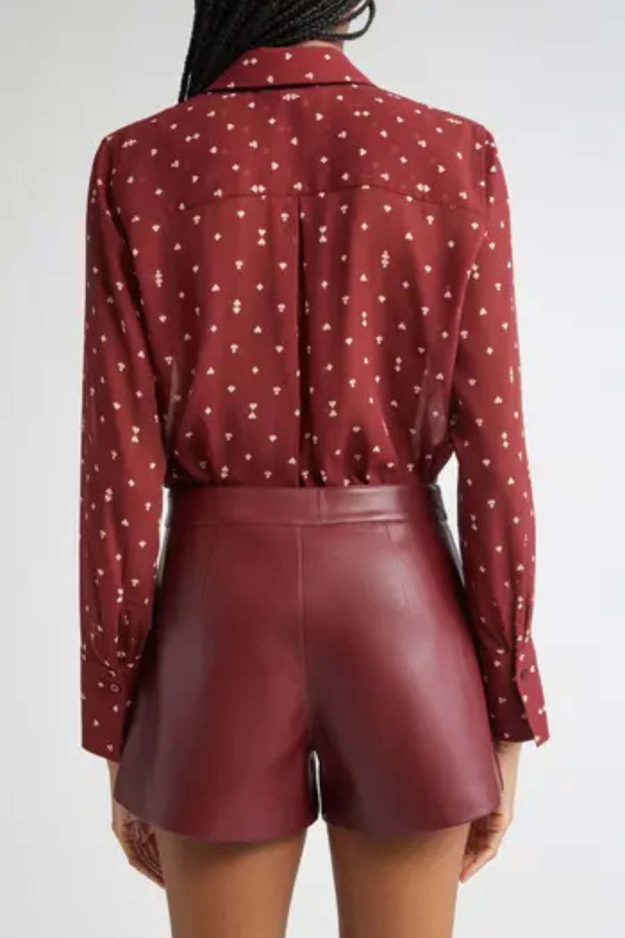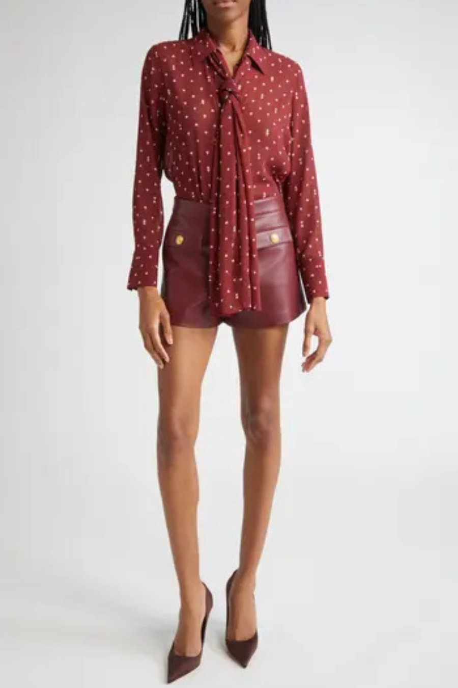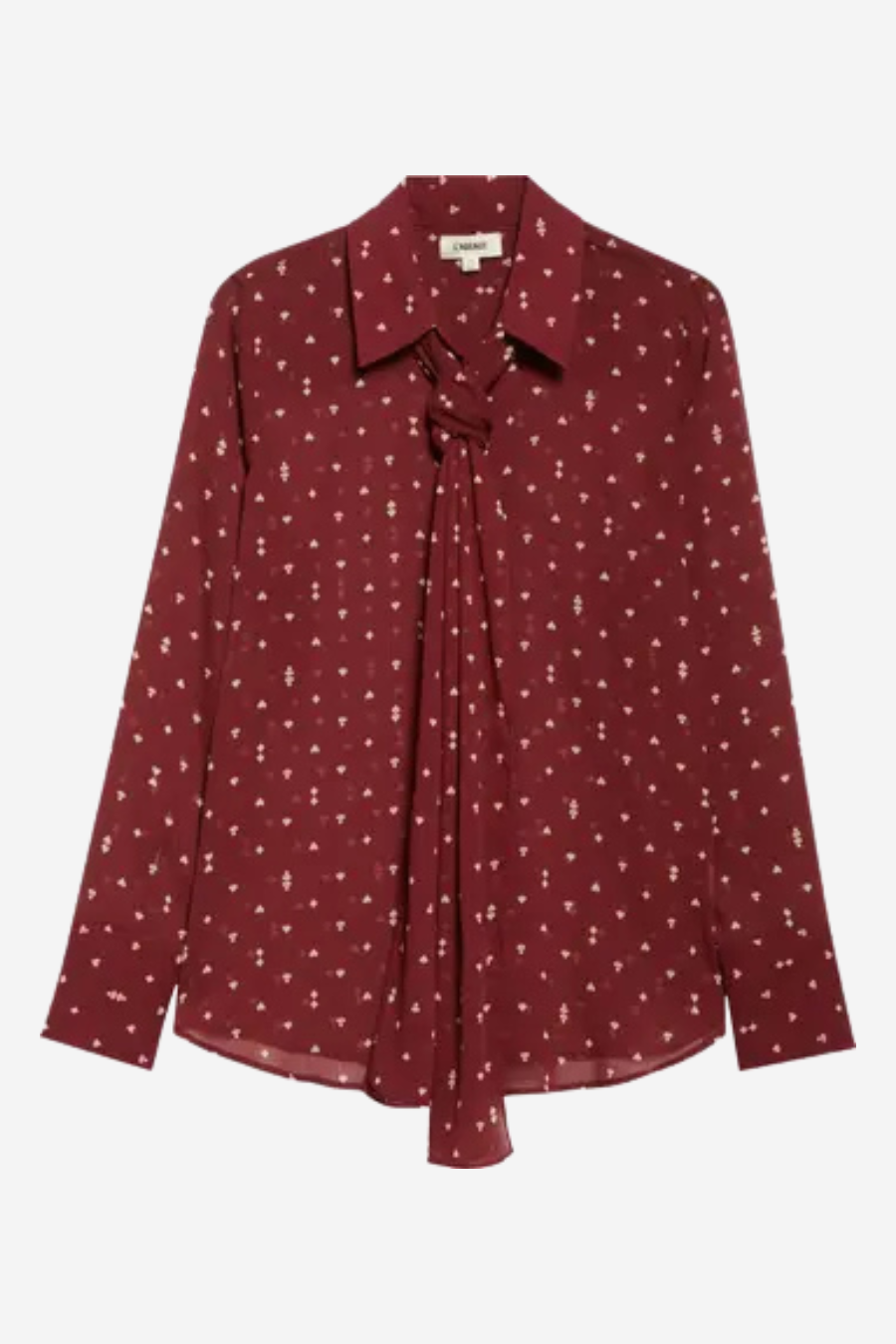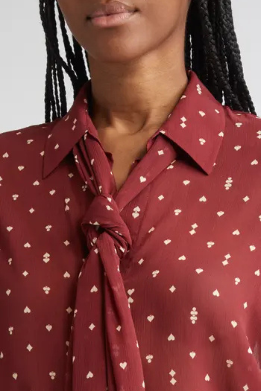 A drapey tie dangles at the neck of this light and airy shirt covered in a charming print.
