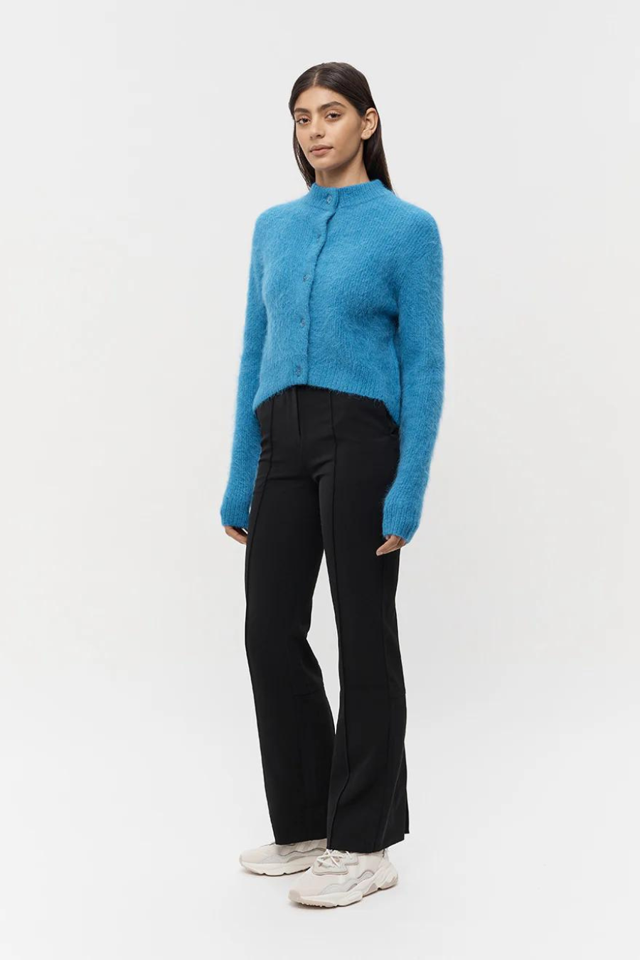 A fluffy cardigan, knitted from a luxe, soft to touch Alpaca blend yarn. Featuring monochrome button detailing for a seamless finish. A versatile piece designed for multi-styling possibility.