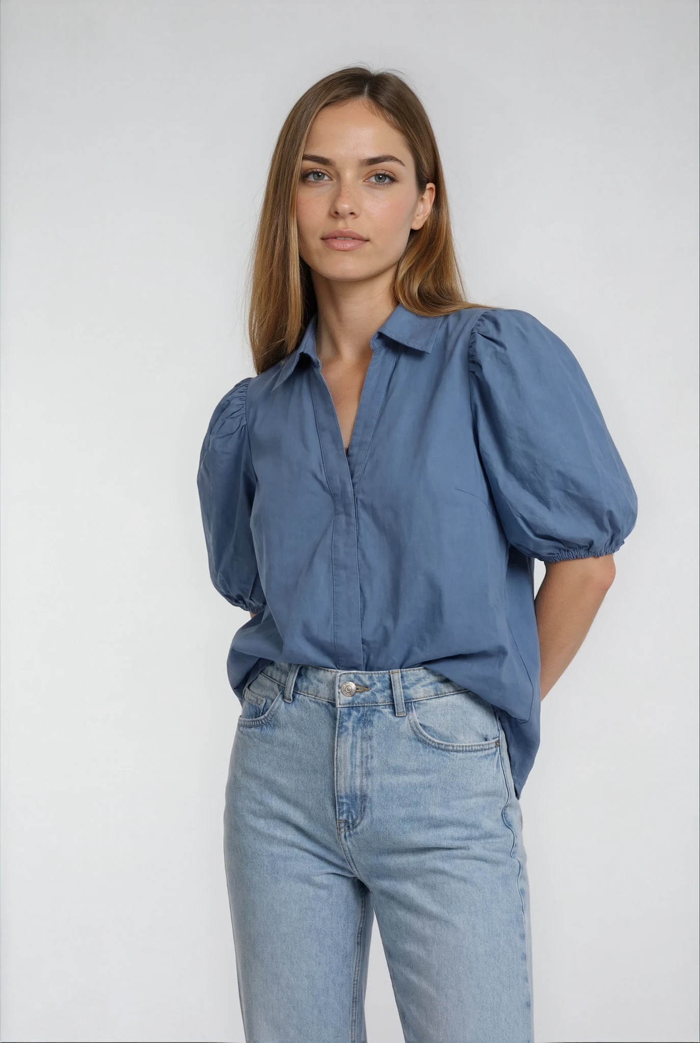 This puff-sleeve blouse brings a fresh, modern statement to everyday styling. Designed with a structured collar, a subtly tailored silhouette, and voluminous sleeves.