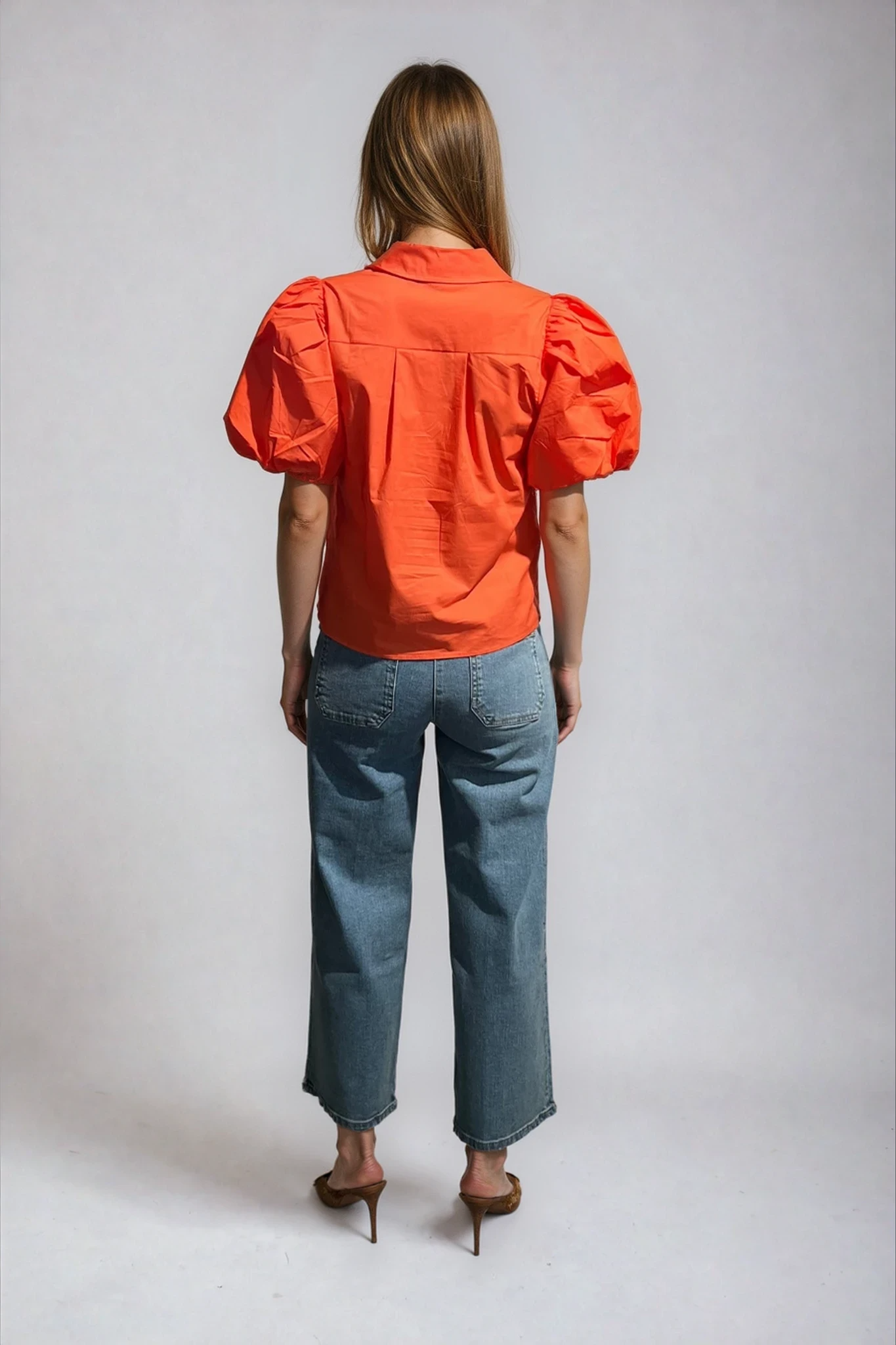 This vibrant puff-sleeve blouse brings a fresh, modern statement to everyday styling. Designed with a structured collar, a subtly tailored silhouette, and voluminous sleeves.