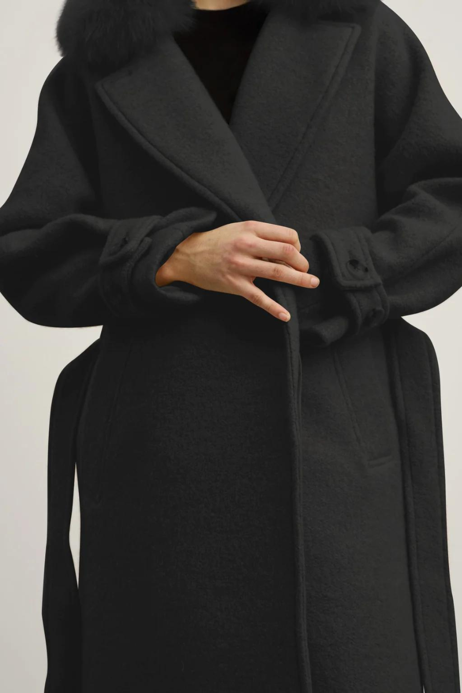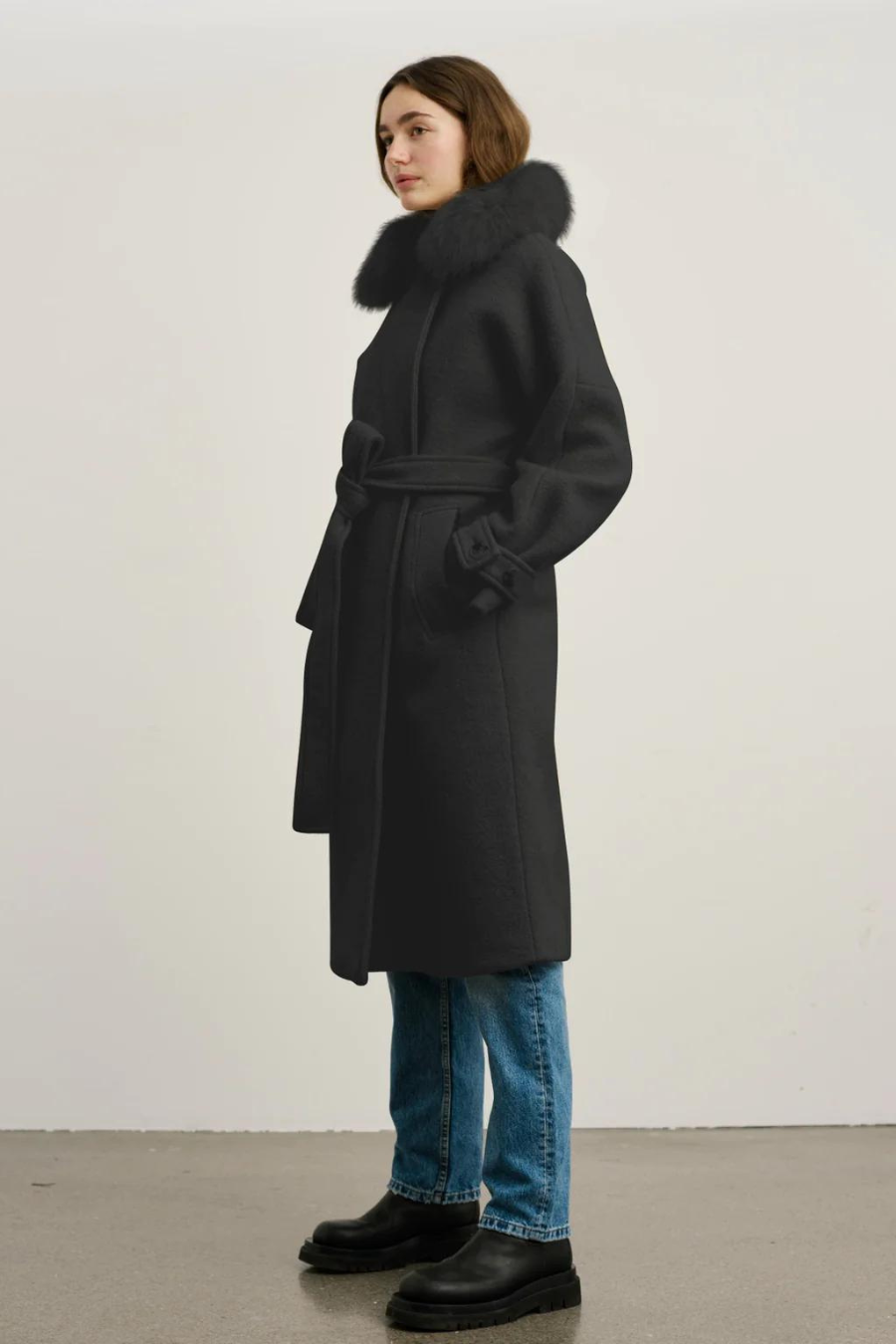Bella is a robe-style straight coat with a relaxed fit, designed in beige fuzzy wool blend with a detachable fur collar and waist belt. The coat has slip side pockets and a soft inner lining. The lapel neckline can optionally be closed with a button for colder days.