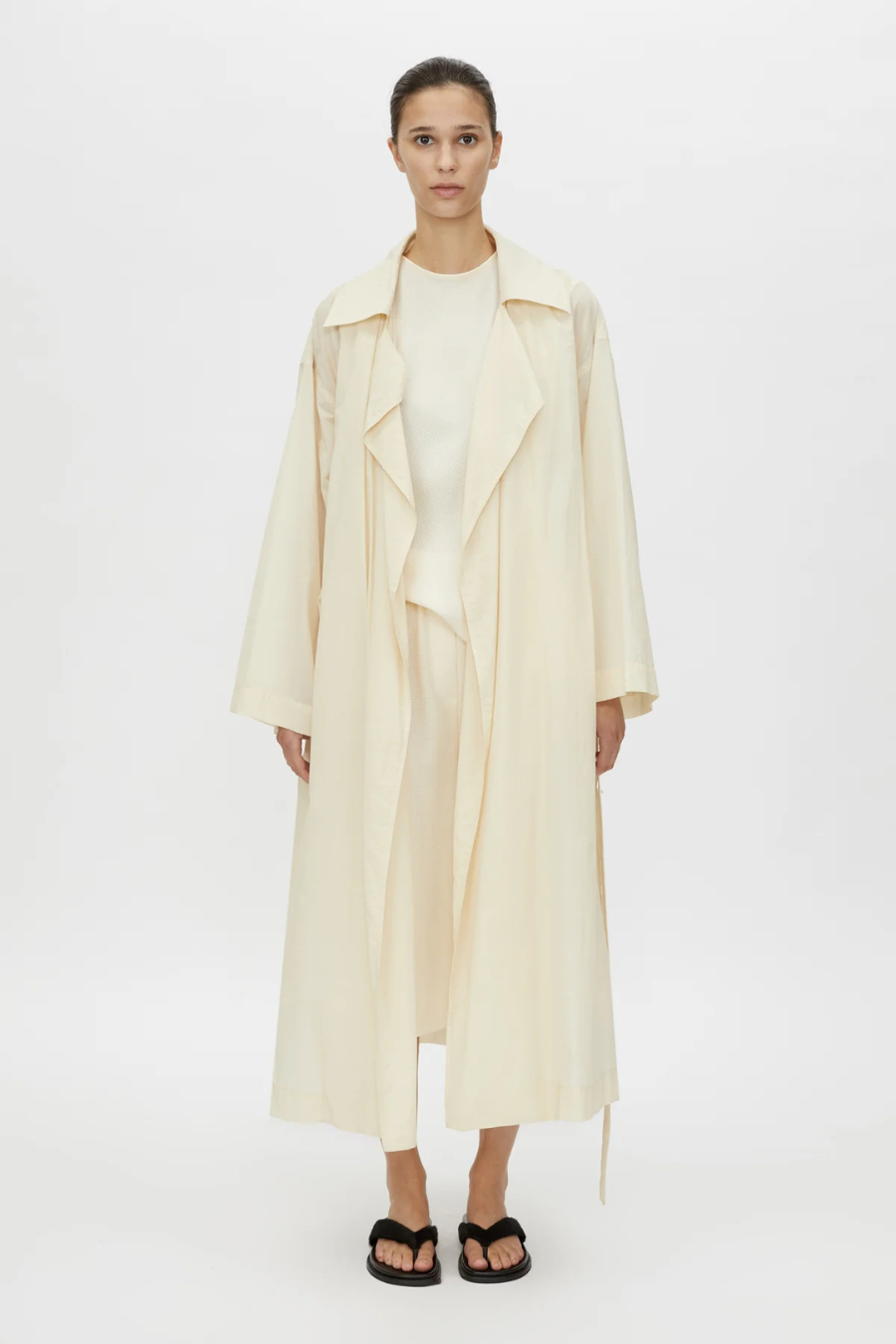 CAMILLA AND MARC Bernini white light-weight relaxed trench coat. Inseam side pockets, detachable belt, storm flap at back. Unlined with clean internal finishes.