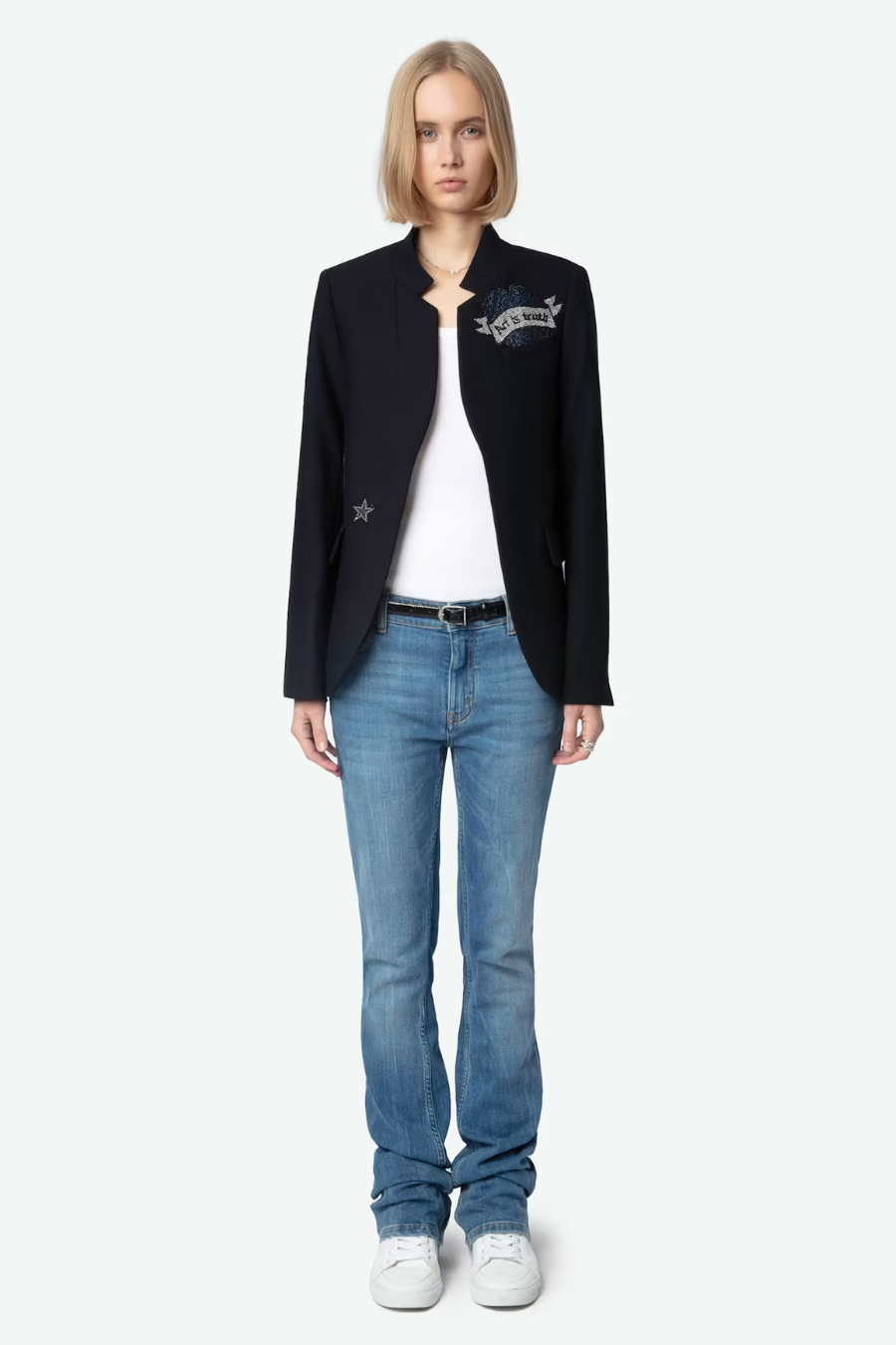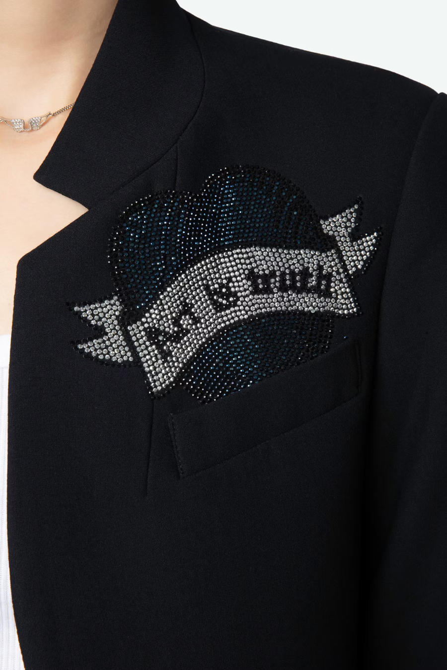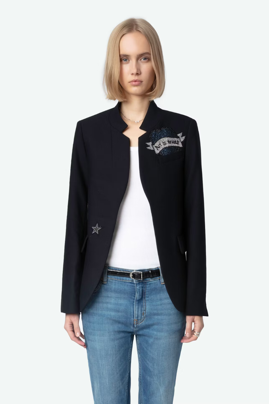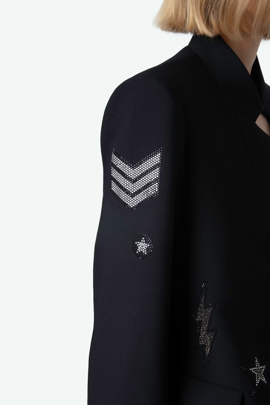 Zadig & Voltaire women's blazer, no buttons, collar with dart, embellished with rhinestones.