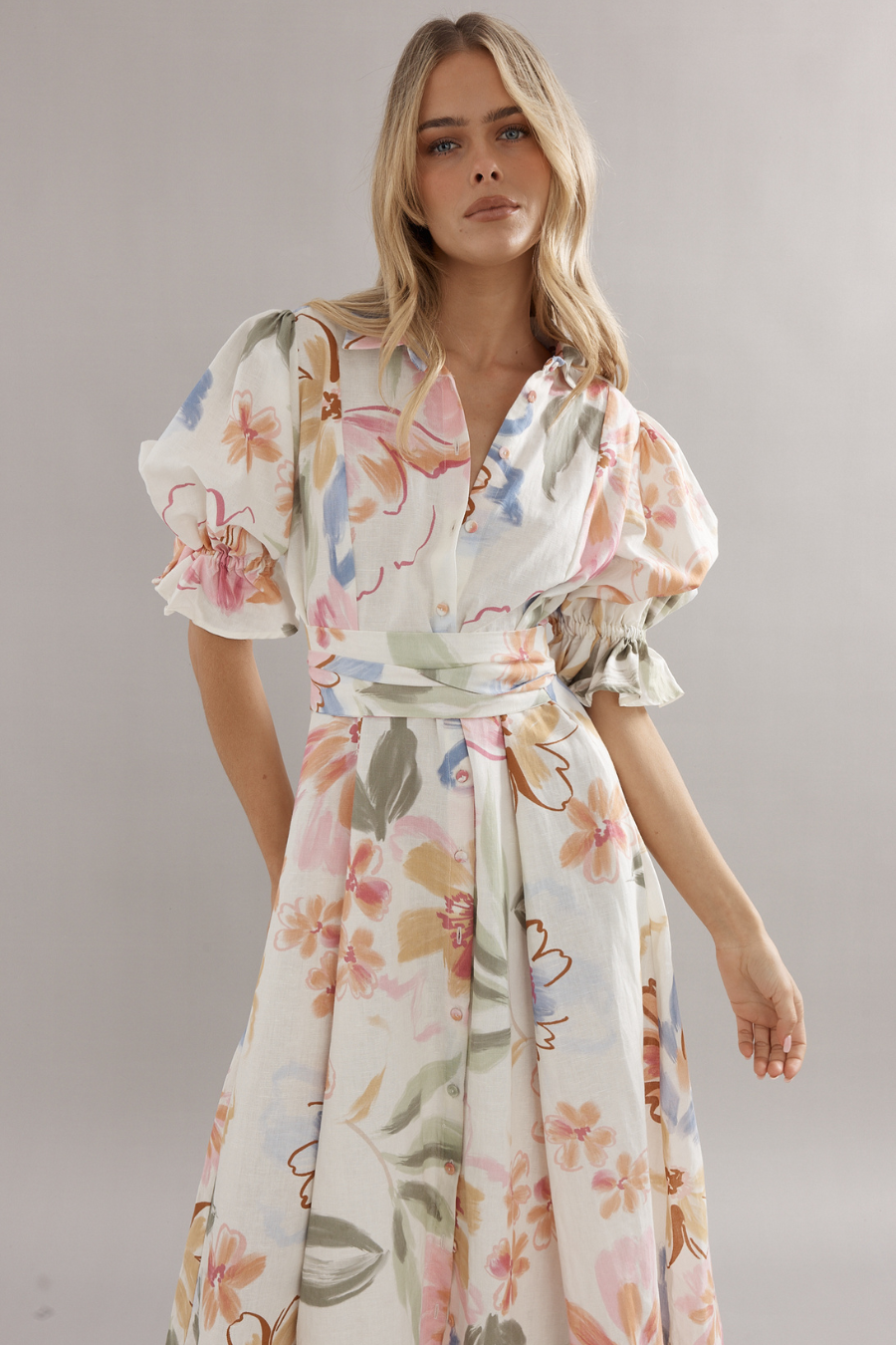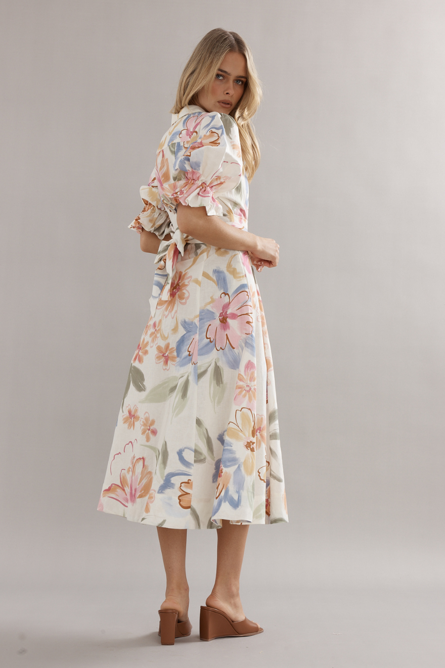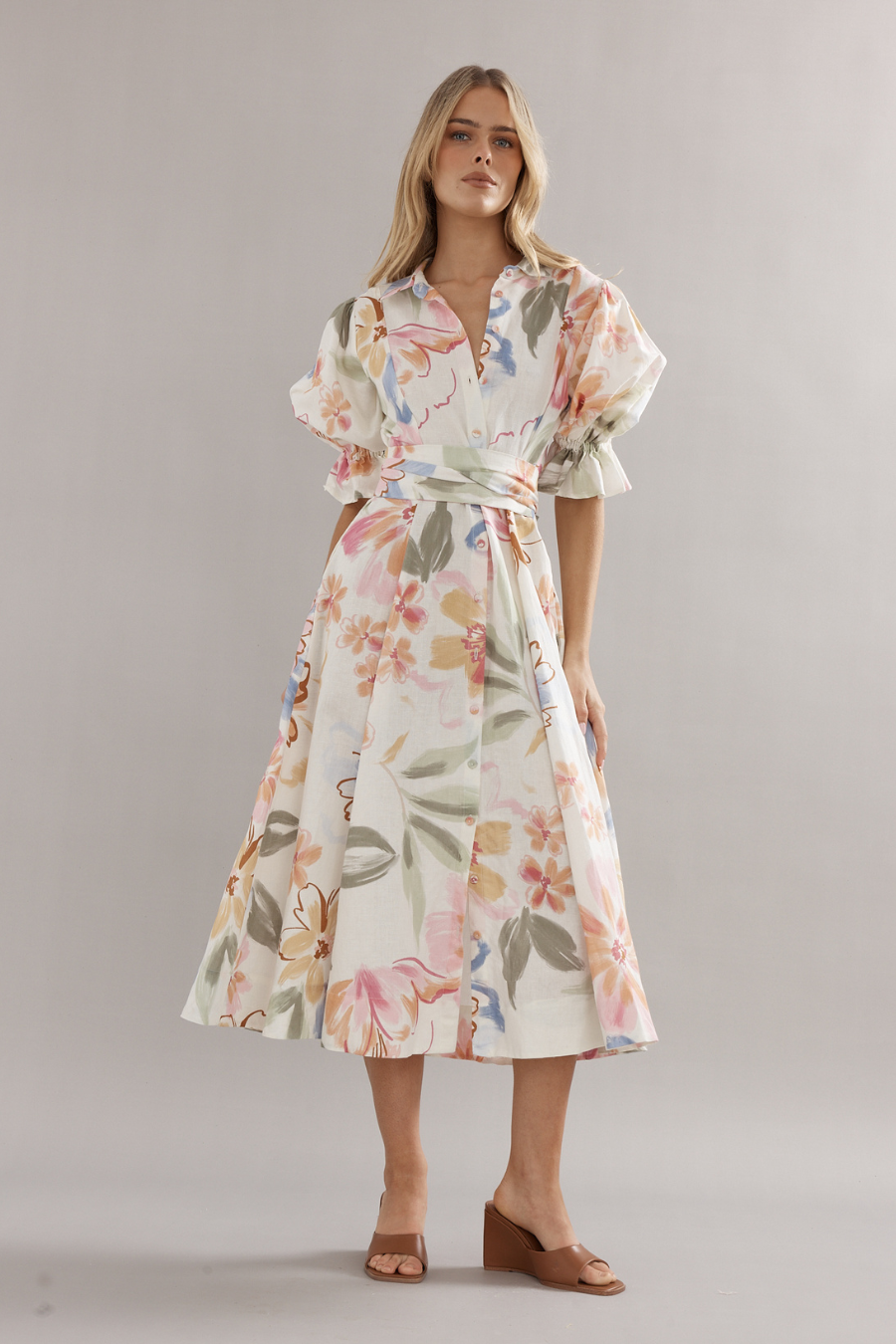 Inheriting the silhouette of the classic Lady Vincent Dress, added puff sleeves create the all new Bloom Dress in a classic Tea Party Floral Linen. Designed with a structured collared neckline, and a flattering midi-length hem, it balances relaxed tailoring with refined femininity. Whether you're dressing for a long lunch, a day at the office, or a summer celebration, this dress moves with ease from one occasion to the next.