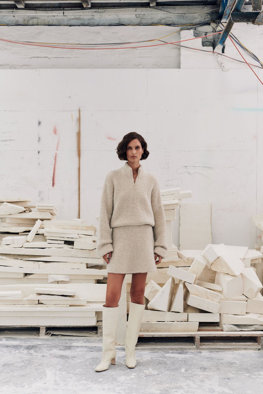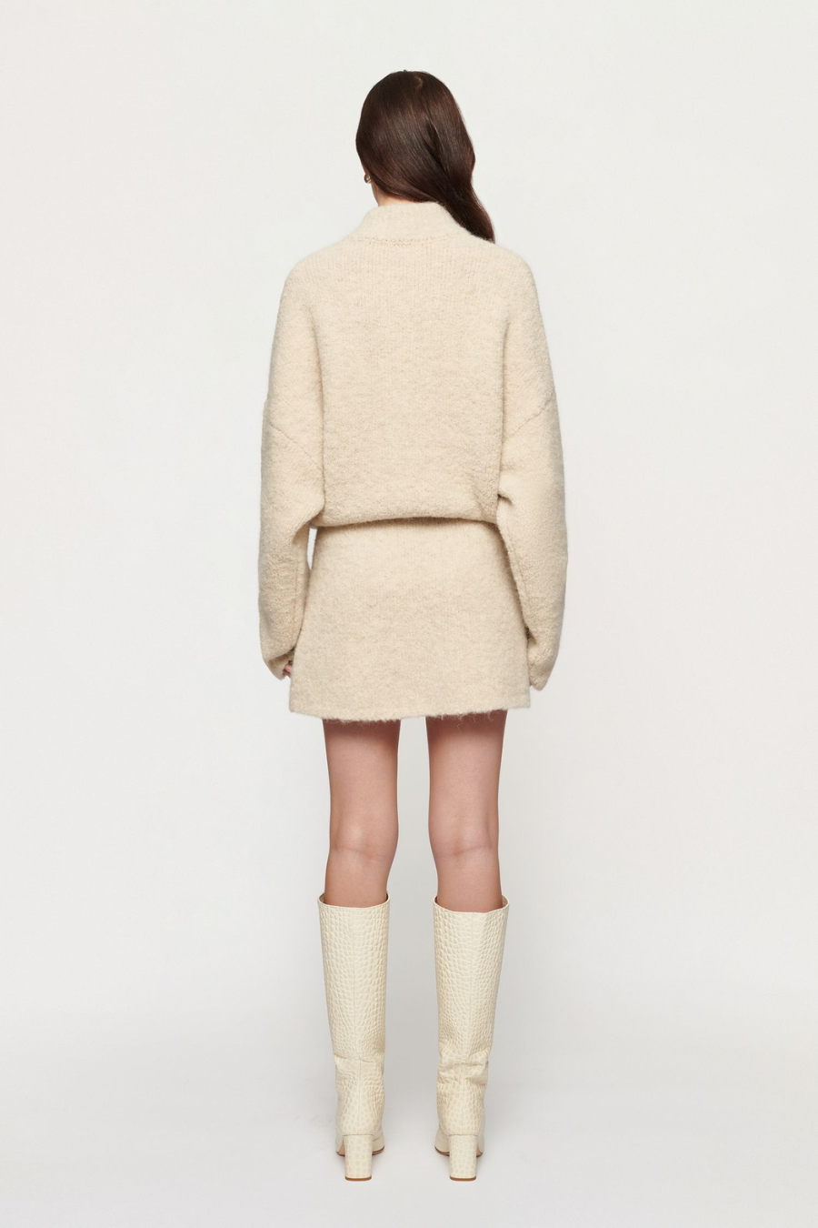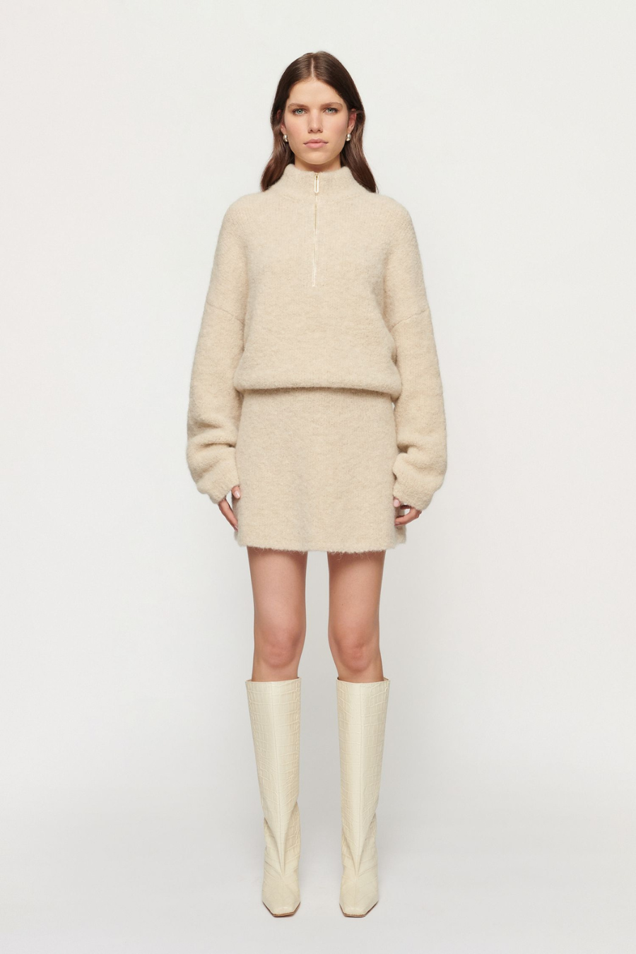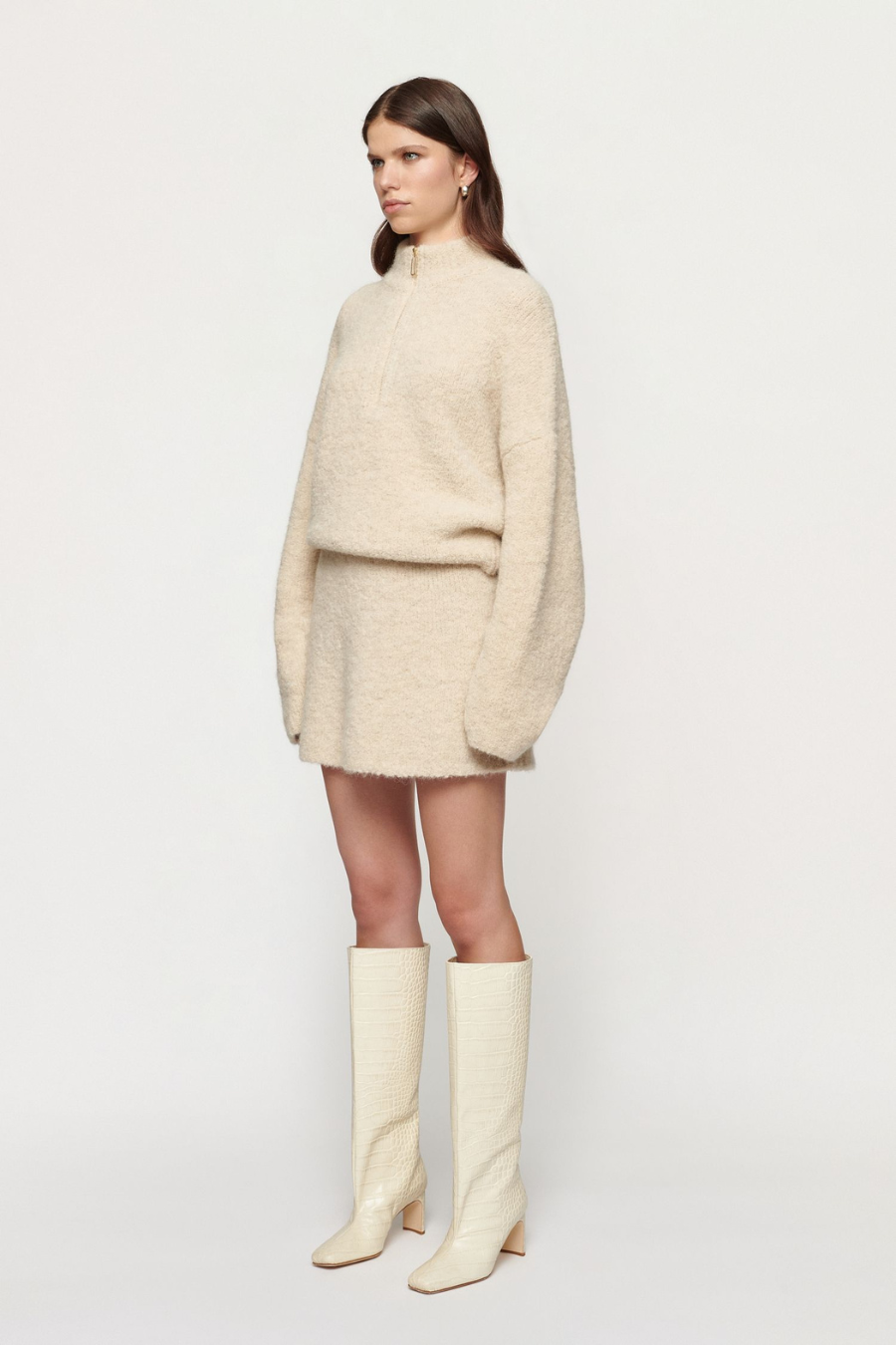 Introducing the Boyd Boucle Half Zip, a blend of wool and alpaca yarn creates a cozy, soft hand feel. It features a high collar, dropped shoulders, and rounded sleeves, fastened with a heavy gauge metal zipper and soft gold puller. A subtle rib detailing can be found on the neckline, hem and cuffs. Complete your look with the Penn Boucle Skirt for effortless elegance.