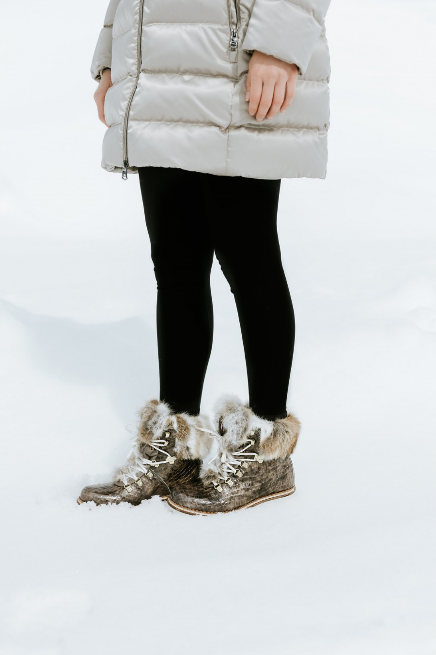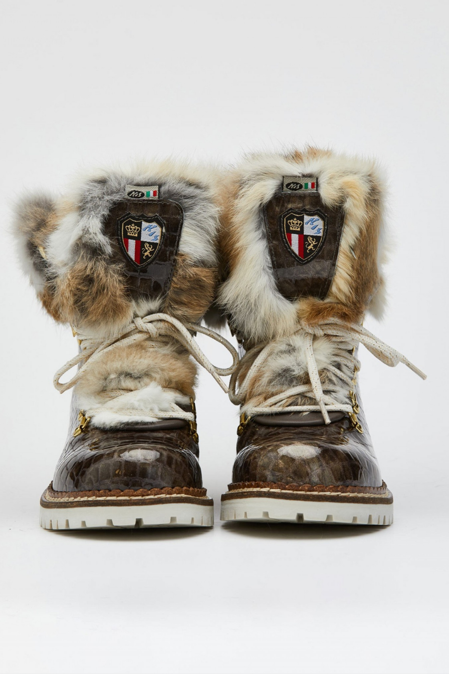 Lace-up ankle boot in taupe-coloured varnished calfskin with 'Croco' effect and beige and white shaded lapin fur collar.