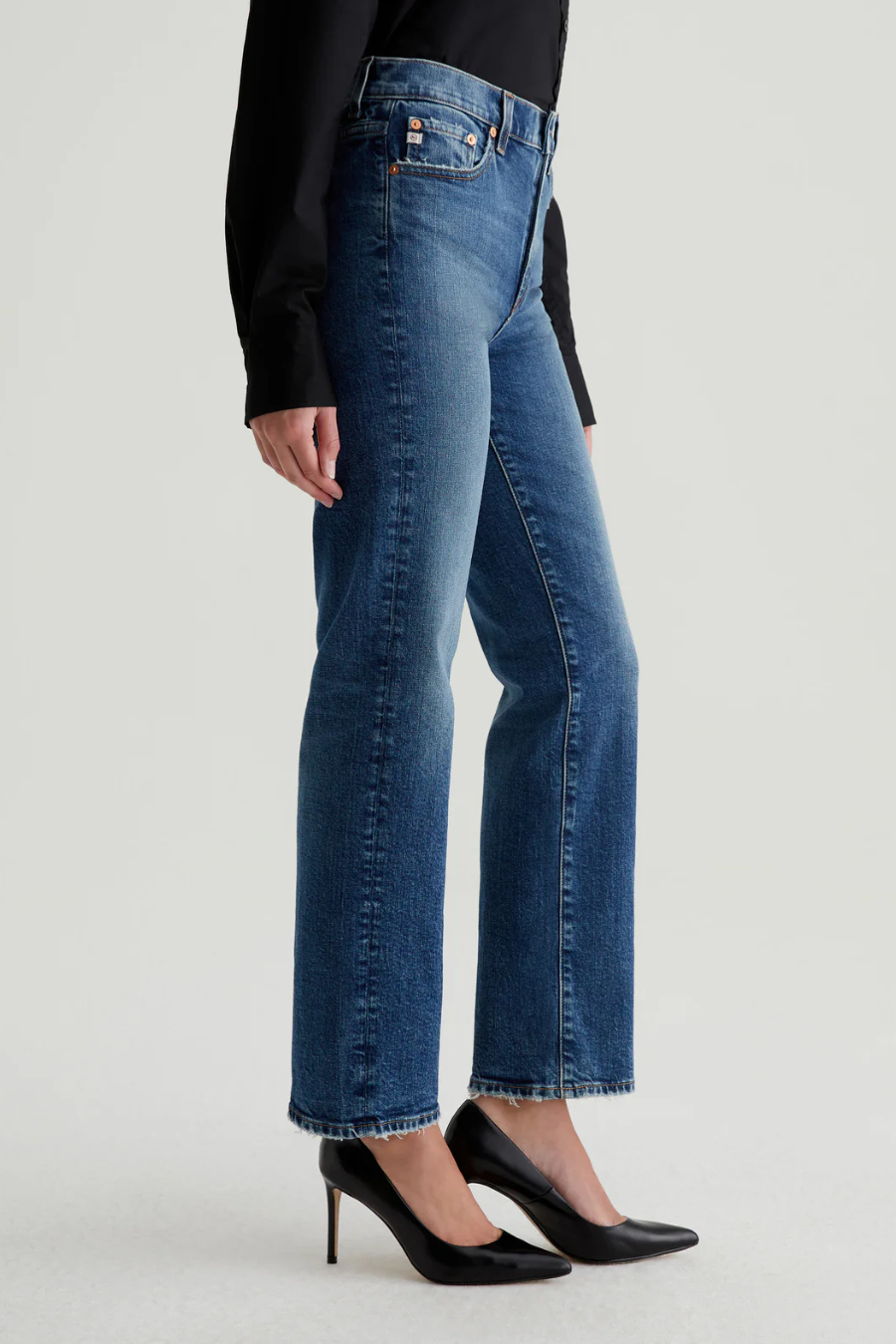 Brinley is a mid-rise straight fit crafted in Vintage Comfort Stretch Denim from Italy. These five-pocket women's jeans sit right at the natural waist and fall to a classic straight-leg silhouette. This pair features a medium indigo AG-ed™ Denim wash with faded details and distressed edges to replicate 15 years of authentic wear. Marigold topstitching adds a traditional finish.