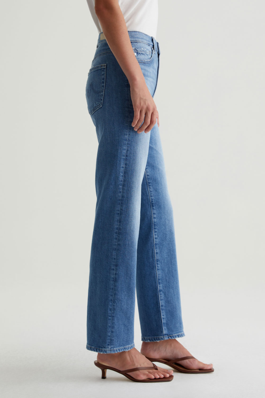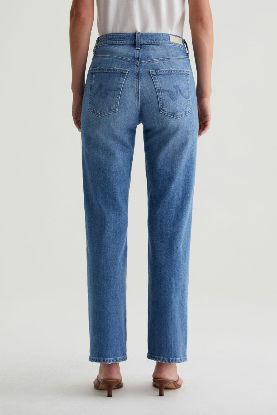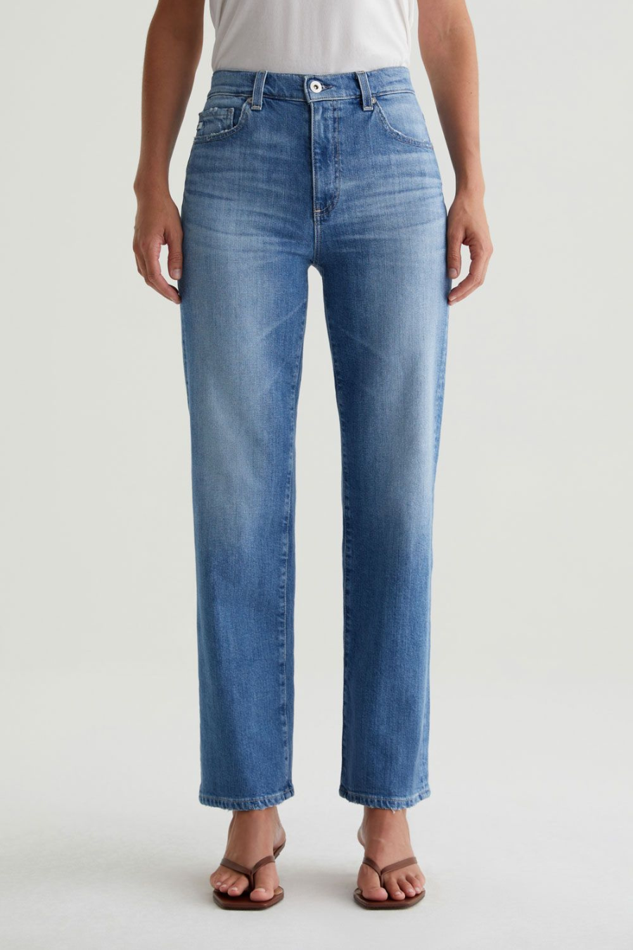 Brinley is our mid-rise straight fit for women. These five-pocket jeans sit right at the natural waist and fall to a classic straight-leg silhouette. Designed in 11.75 oz. Vintage Comfort Stretch Denim from Italy, this pair offers a timeless medium blue wash with fading, whiskering, and worn edges.