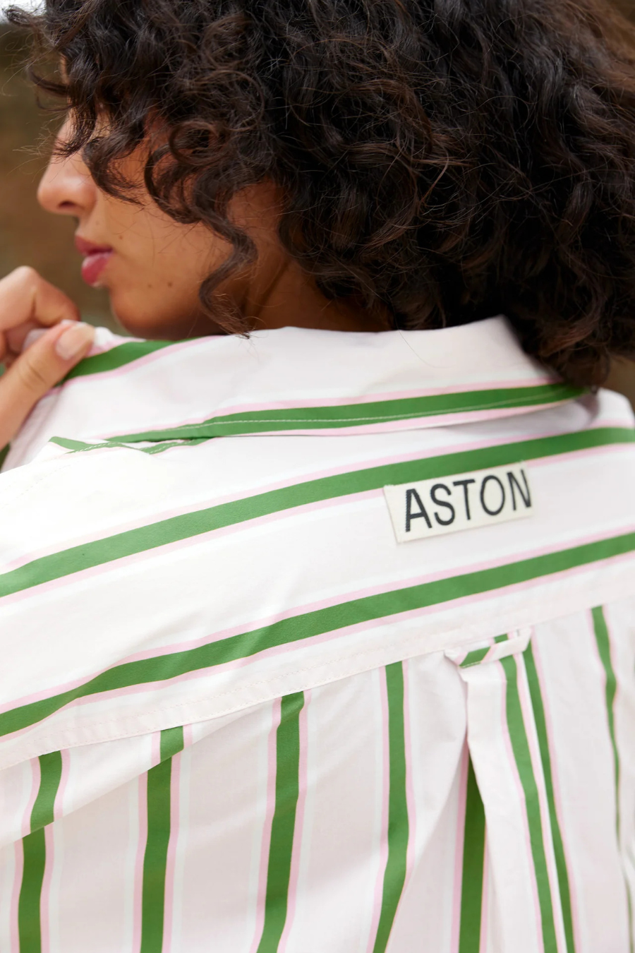 This effortlessly chic striped shirt is a wardrobe staple. With a crisp white base and bold green stripes, it offers a relaxed yet refined fit. The button-down design, pointed collar, and chest pocket make it versatile.