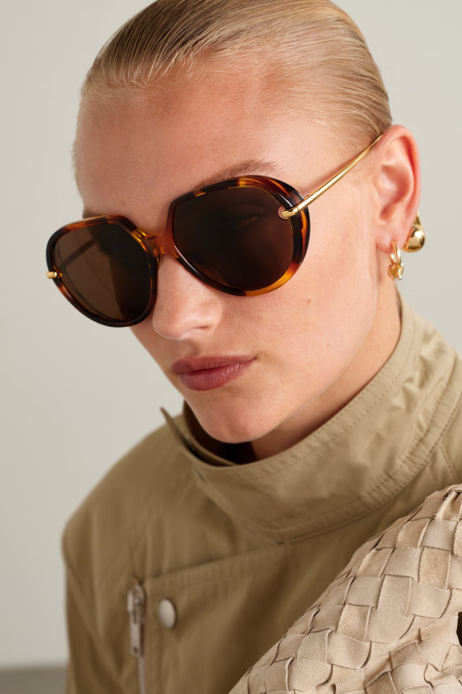 Extra-large rounded design with retro inspiration. Iconic teardrop motif on the end piece. Metal elbow wraps around the front through a hole in the lens and features a slight wing on the side.