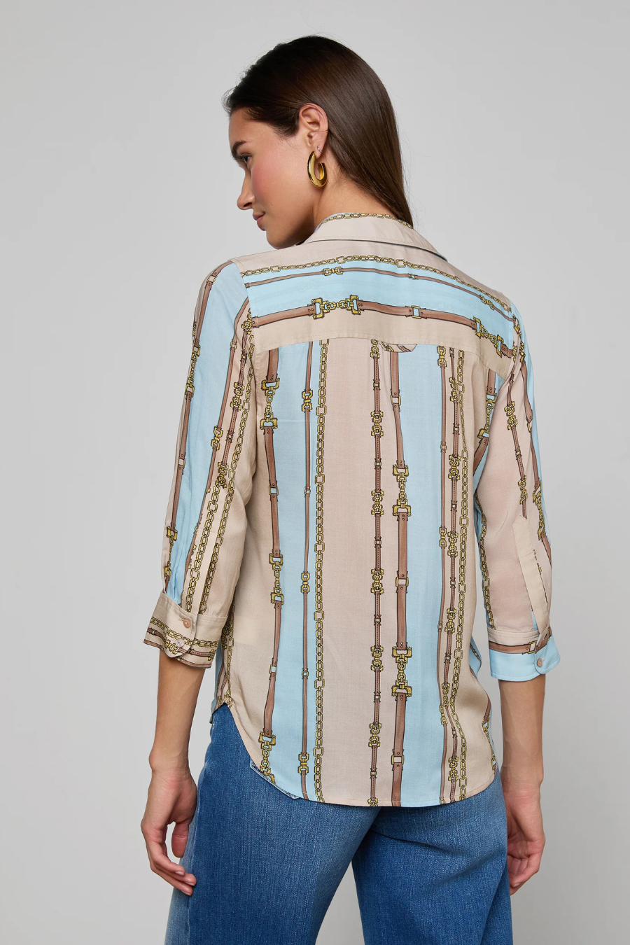 Our signature three-quarter sleeve button-down shirt is now back in a striped belt print.
