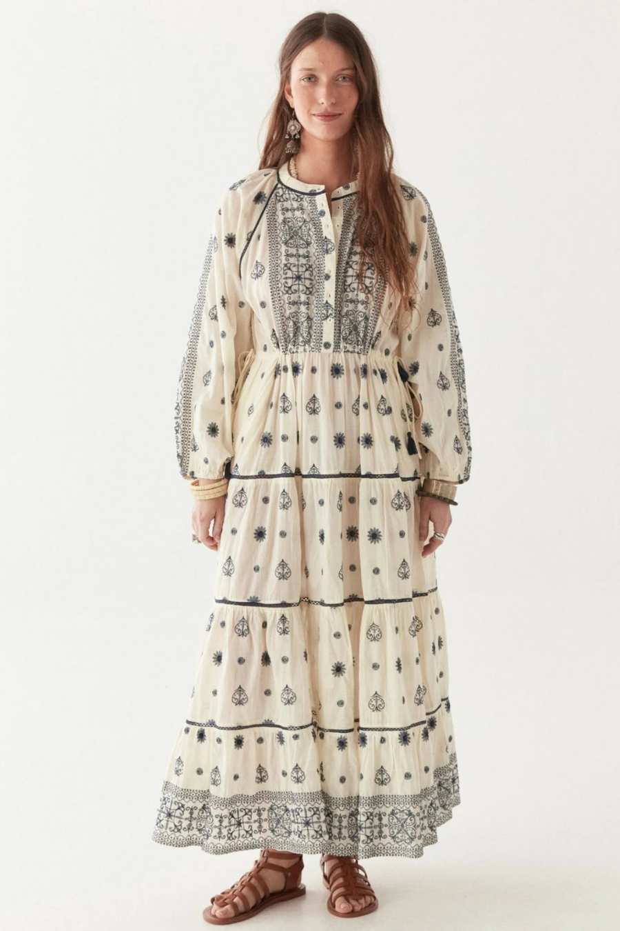 Billowing sleeves and a gathered waist keep the silhouette fluid, effortless. The kind of dress that moves with you, never against. Finished with meticulous border work, a nod to old-world craft, stitched for the present.