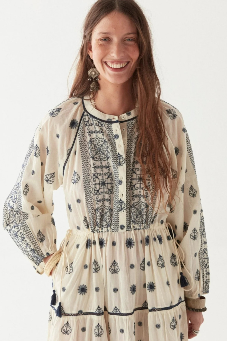 Sun-drenched and steeped in nostalgia, the Caroline Dress is a quiet rebellion wrapped in intricate embroidery. The soft off-white cotton voile serves as a canvas for deep indigo motifs—delicate but with an edge, like poetry written in ink that refuses to fade.