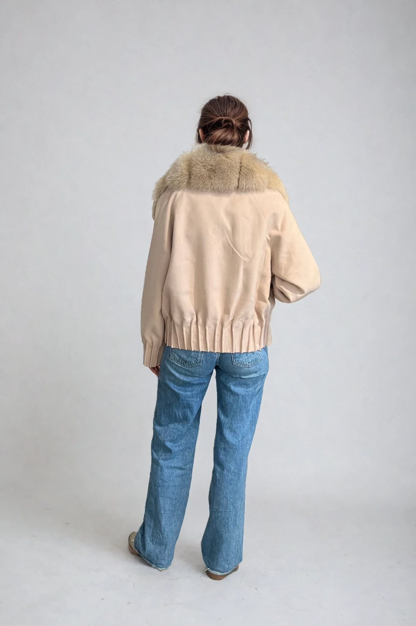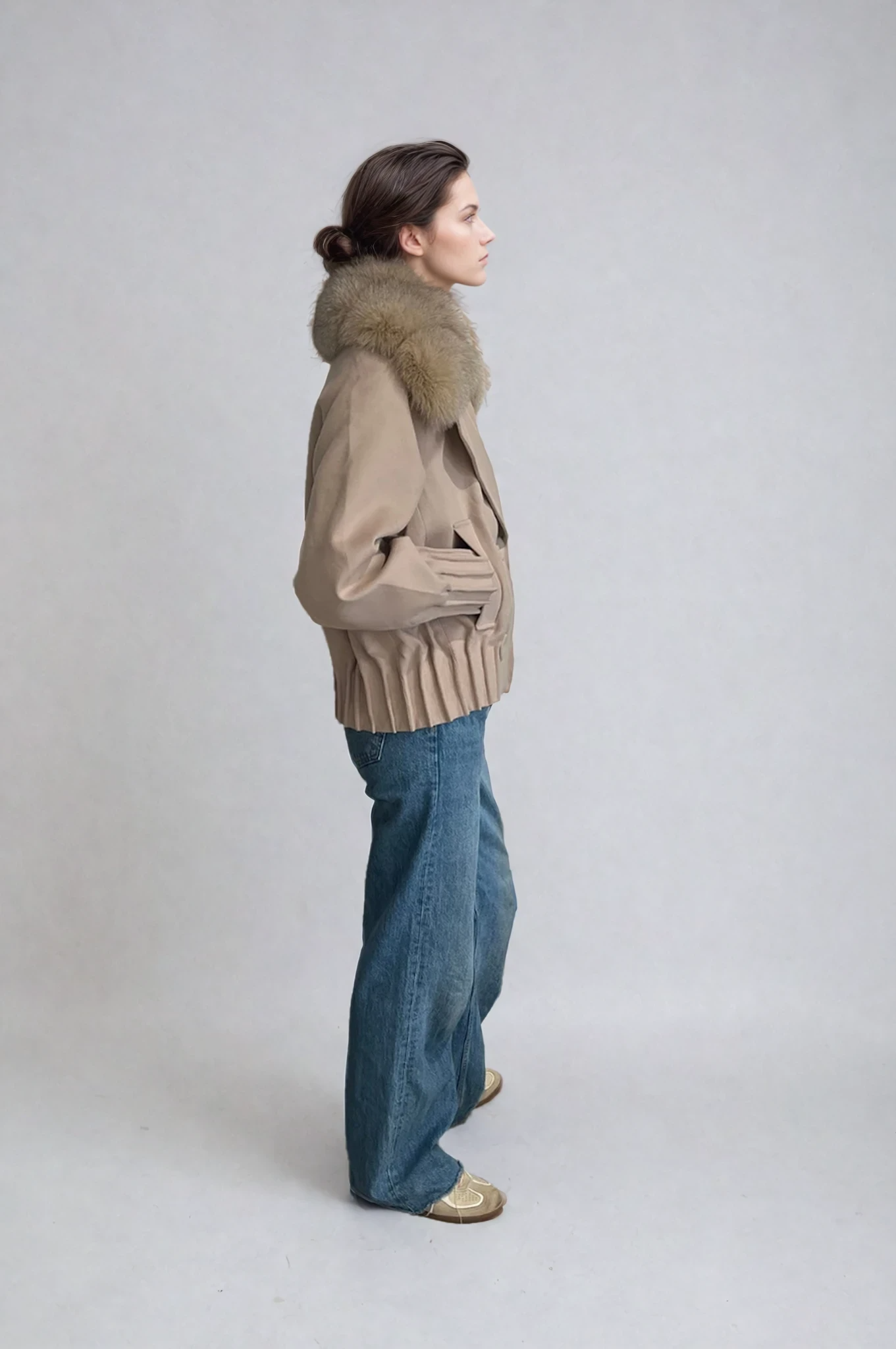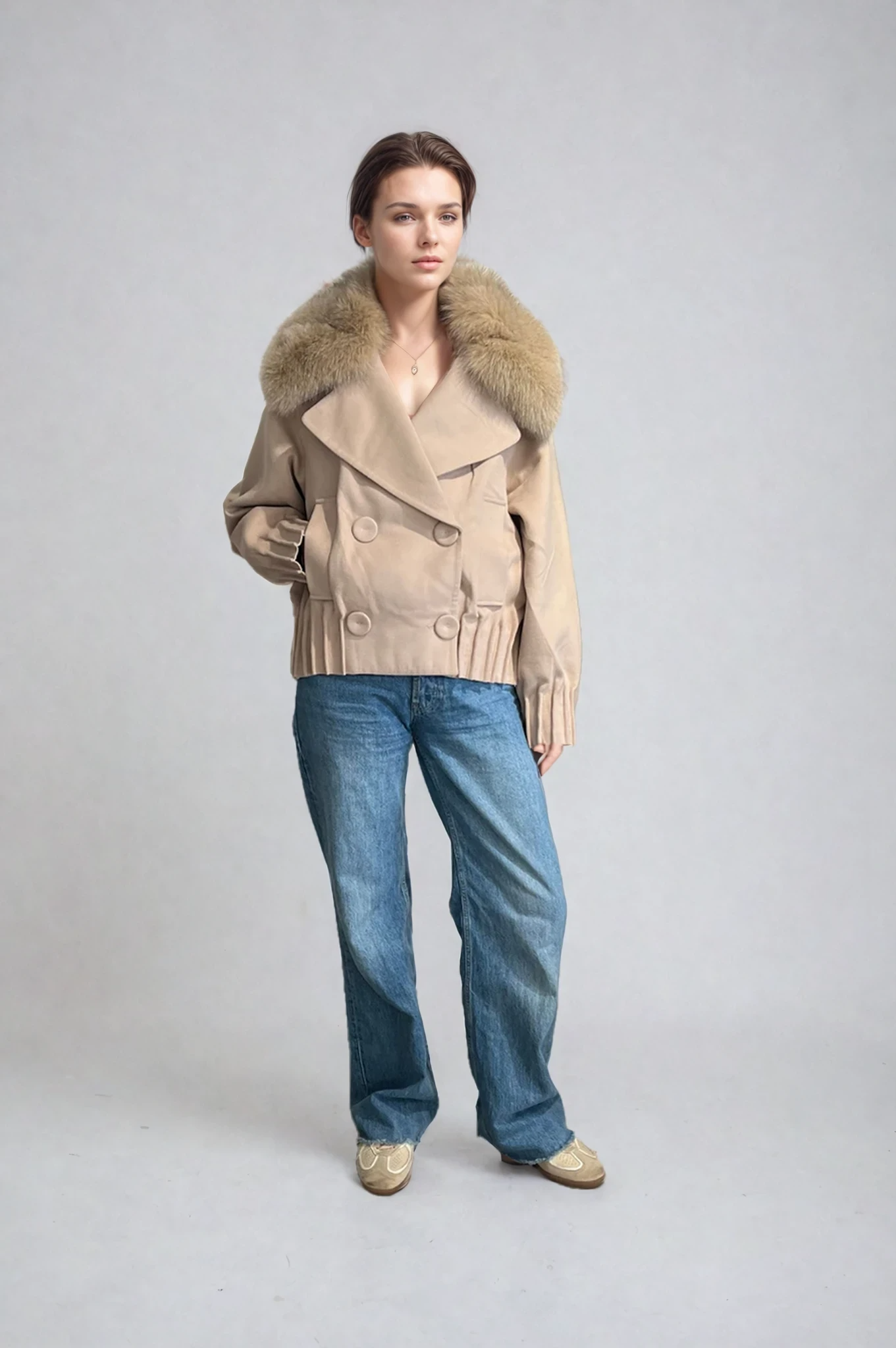 Designed to transcend seasons, this Deval coat is crafted from a luxurious cashmere-wool blend. The cropped silhouette is tailored with a double-breasted front, gathered hem detailing, and statement pleated cuffs. A plush, detachable fur collar adds a layer of warmth and versatility. Wear it with or without for a look that shifts from classic to contemporary with ease. A timeless investment piece with a refined edge.