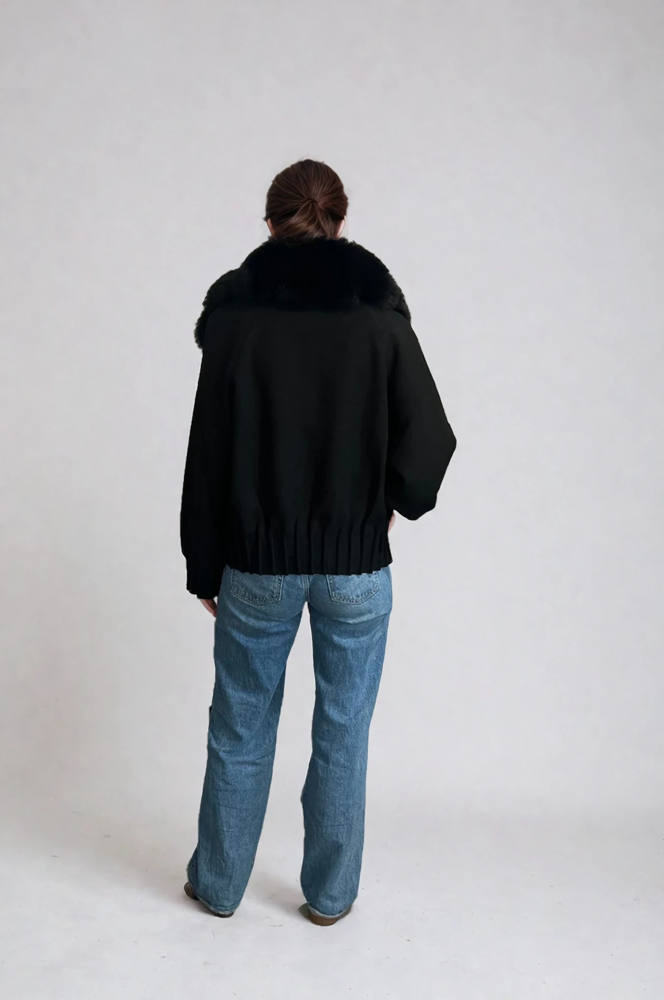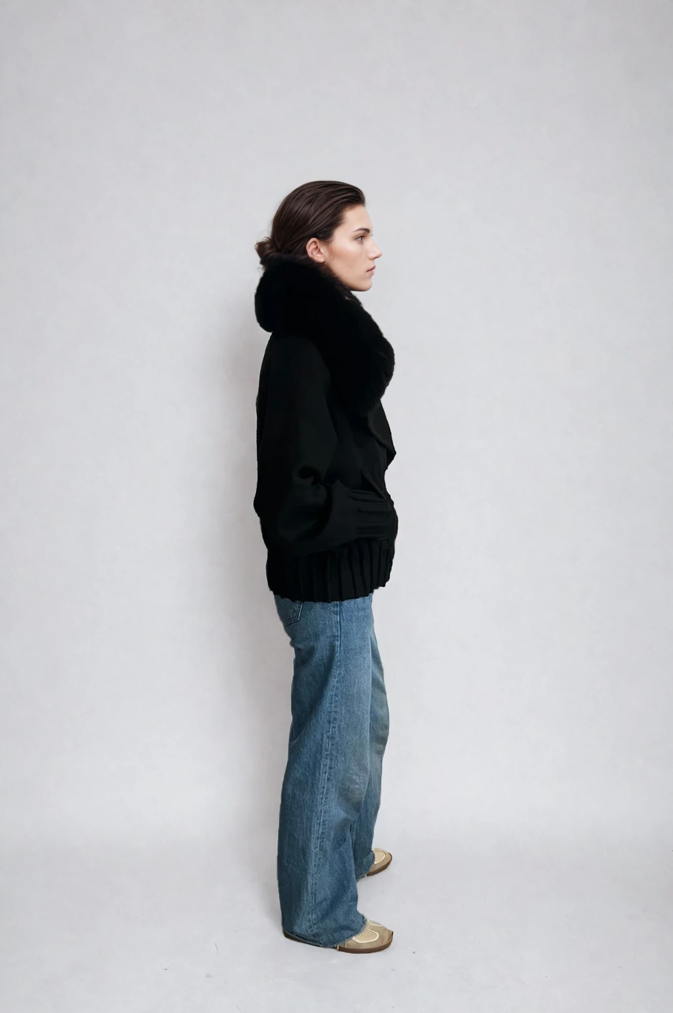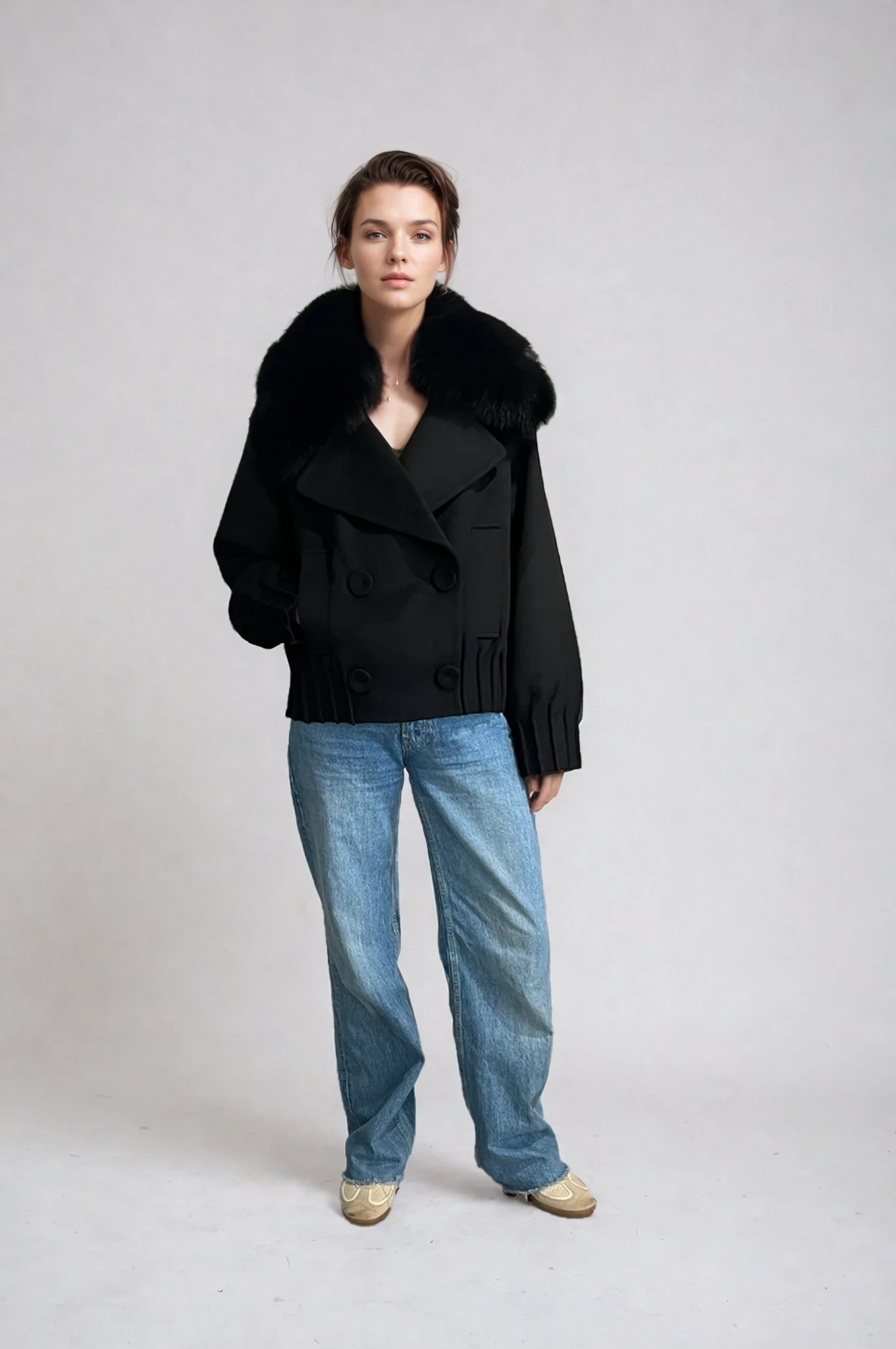 Designed to transcend seasons, this Deval coat is crafted from a luxurious cashmere-wool blend. The cropped silhouette is tailored with a double-breasted front, gathered hem detailing, and statement pleated cuffs. A plush, detachable fur collar adds a layer of warmth and versatility. Wear it with or without for a look that shifts from classic to contemporary with ease. A timeless investment piece with a refined edge.
