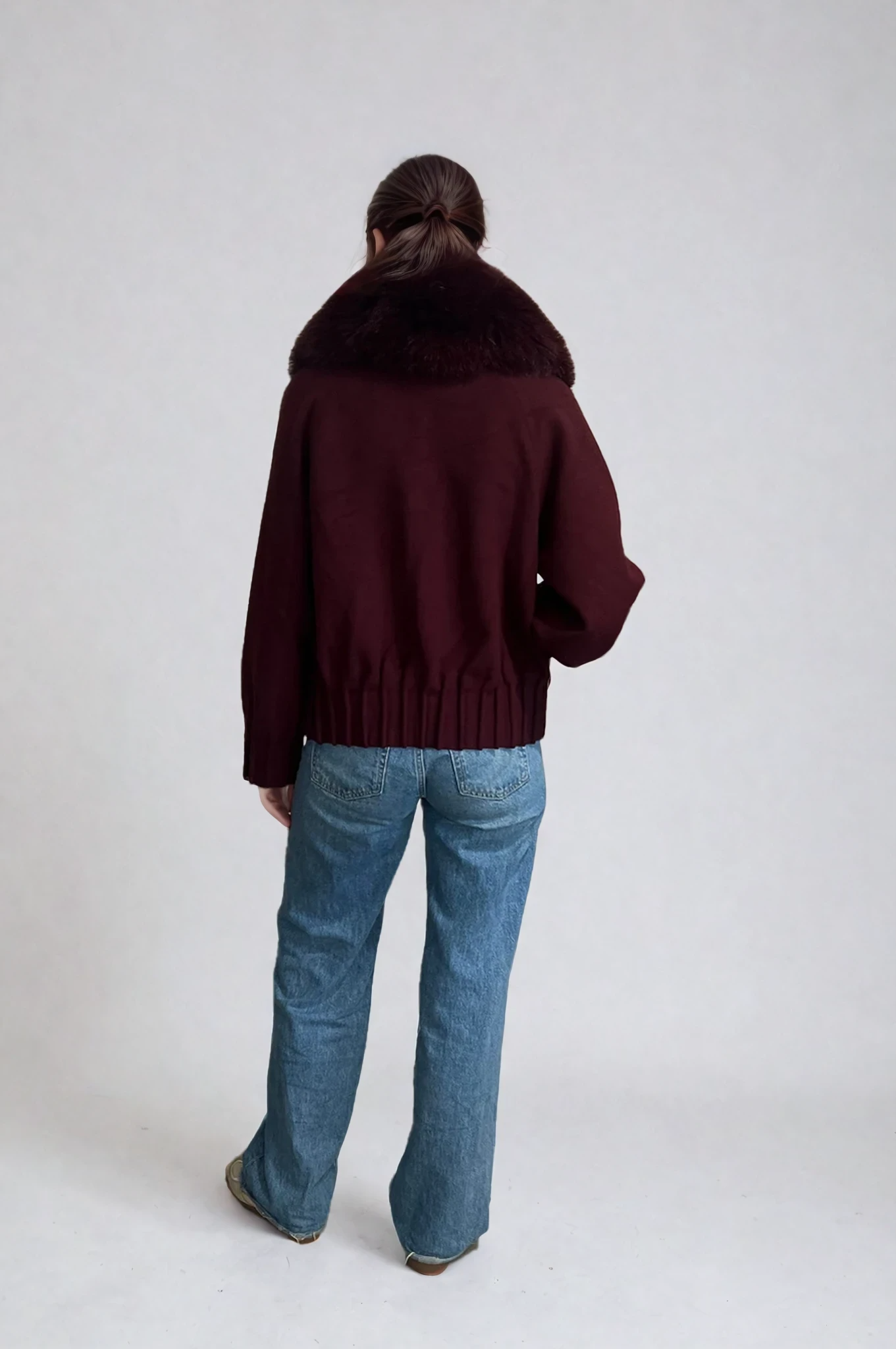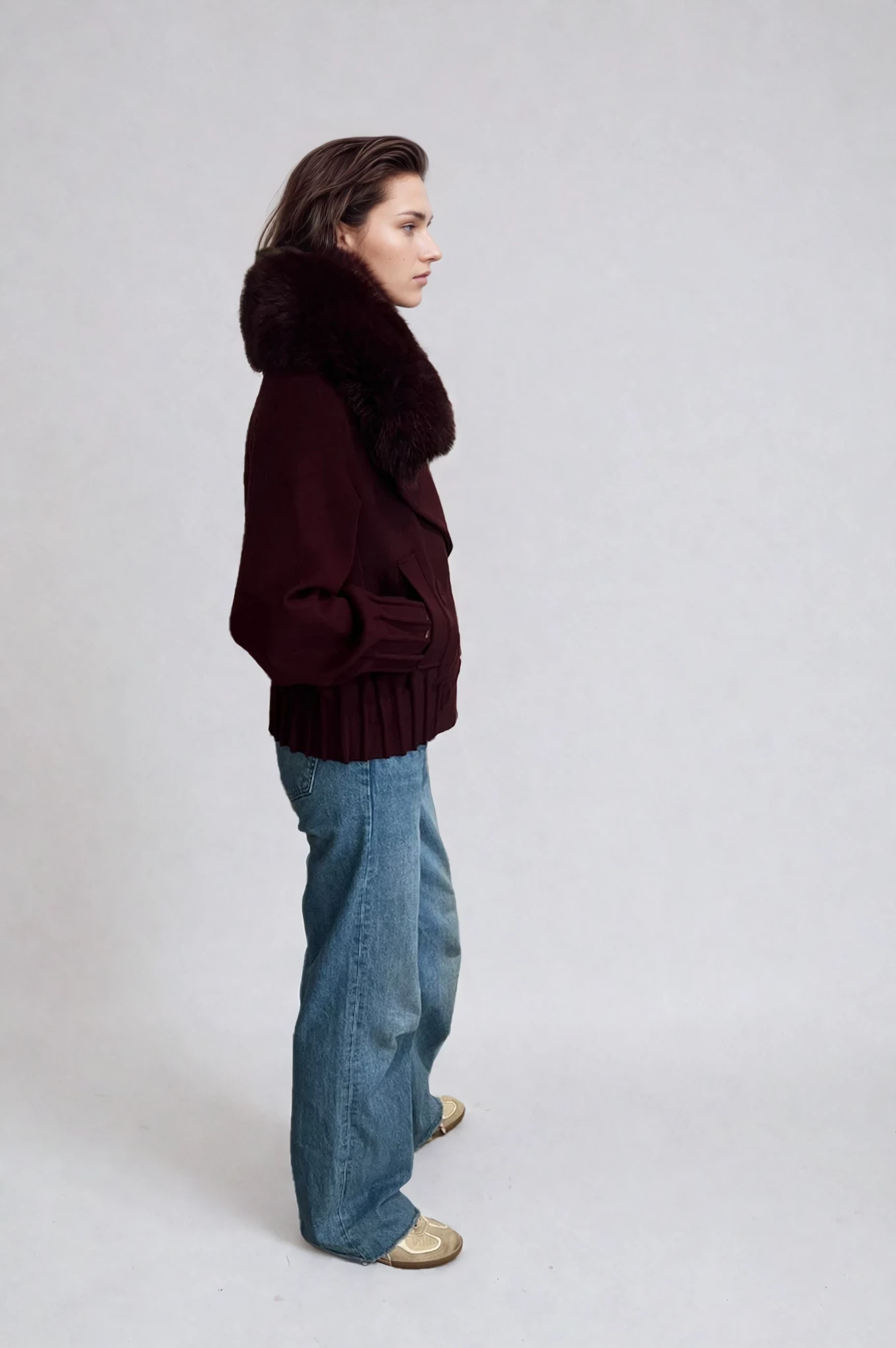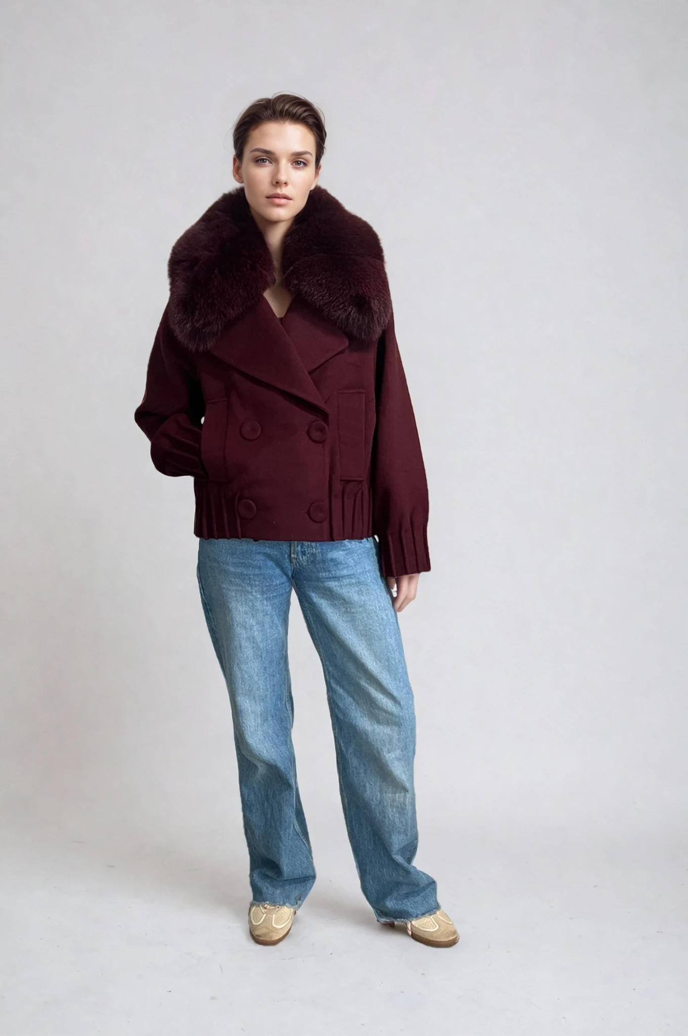 Designed to transcend seasons, this Deval coat is crafted from a luxurious cashmere-wool blend. The cropped silhouette is tailored with a double-breasted front, gathered hem detailing, and statement pleated cuffs. A plush, detachable fur collar adds a layer of warmth and versatility. Wear it with or without for a look that shifts from classic to contemporary with ease. A timeless investment piece with a refined edge.